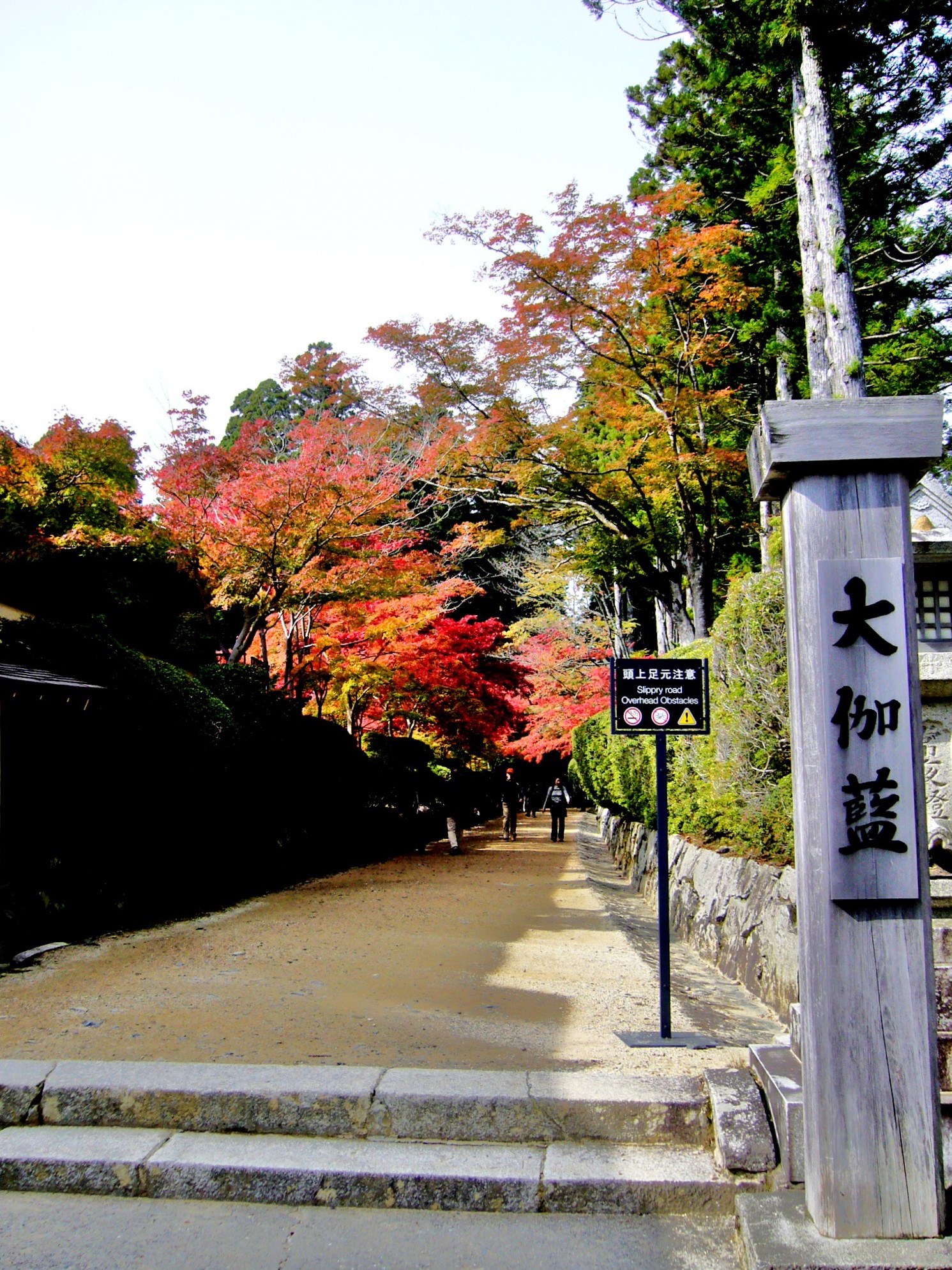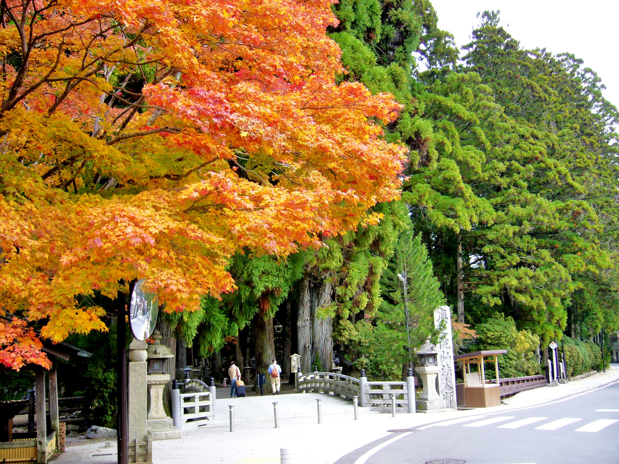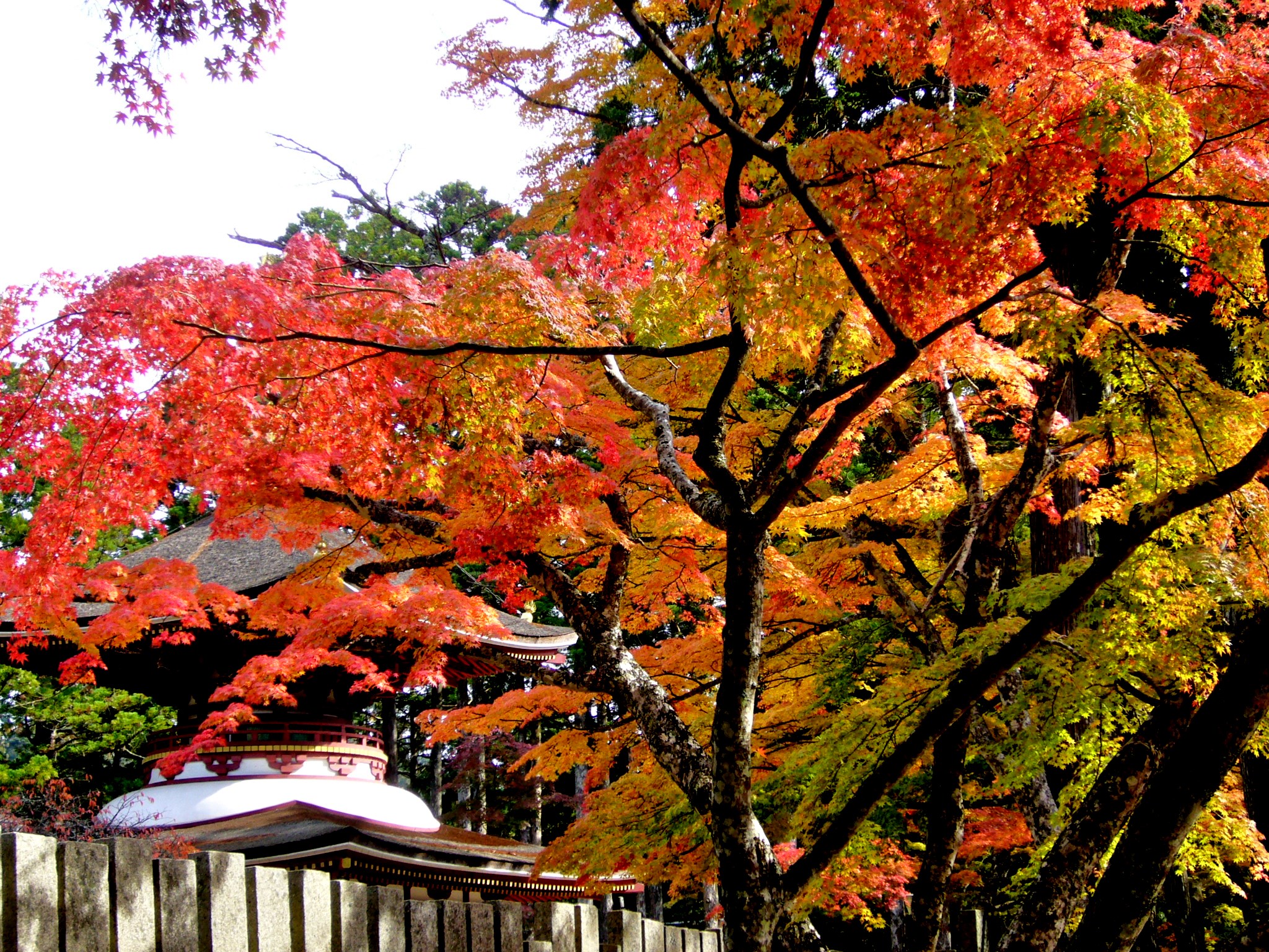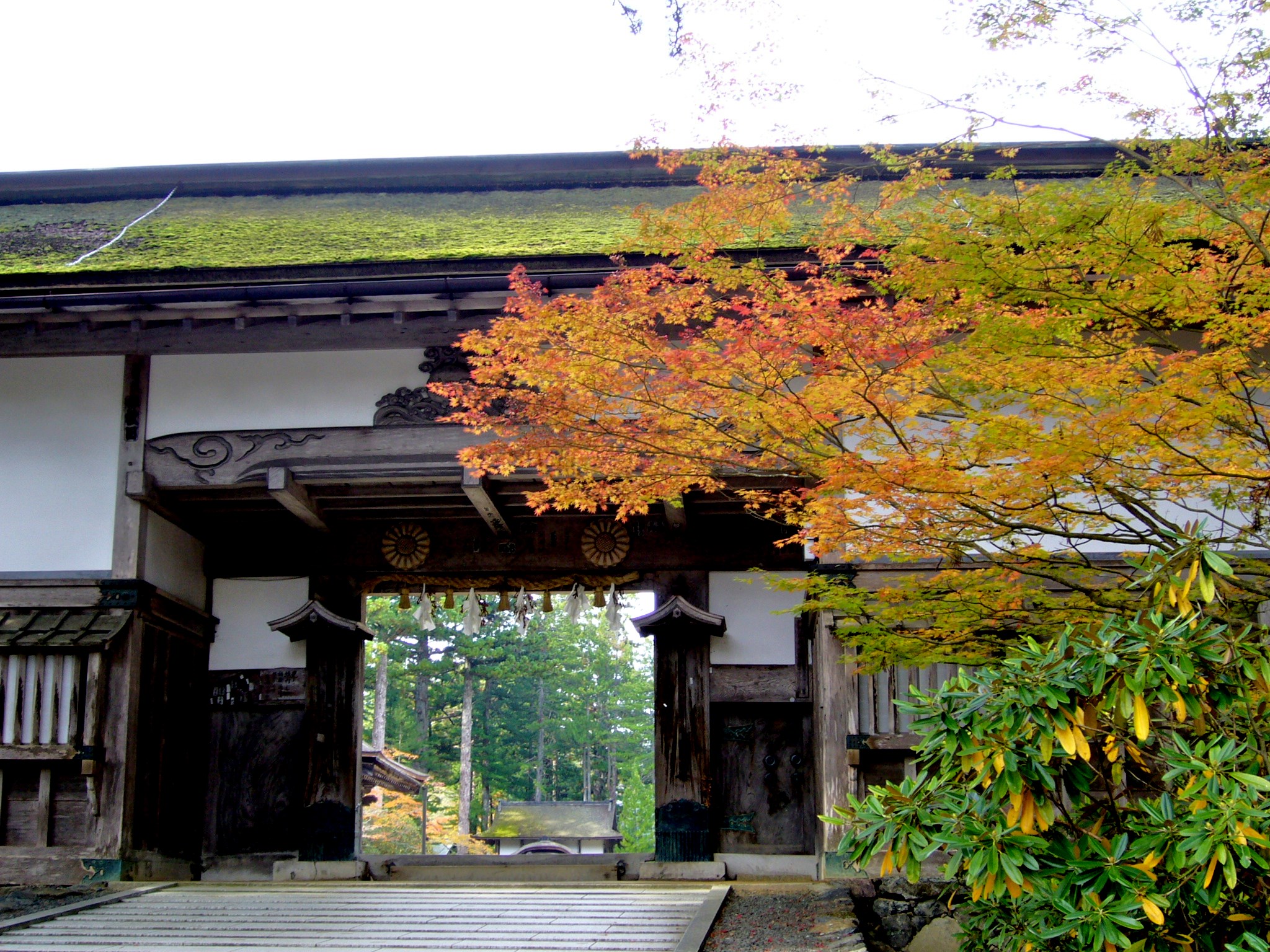 ここから紅葉を愛でながら空海が毎日通ったという壇上伽藍と総本山金剛峯寺を結ぶ「蛇腹道」を通って「金剛峯寺」に向かいます。大伽藍は僧侶達の修行の場であり、金剛峯寺から大伽藍に 行く道が幅およそ3m長さ100mの道が蛇腹道です。大師はこの地を「東西に龍が伏せるがごとく」と形容されていて、壇上伽藍を頭に、現在の蓮花院(千手院橋バス停袂)までが龍は伏している形に例え、ちょうどこの小道が龍のお腹の部分にあたることからその名が付いたと言われています。両脇の木は馬酔木が植えられているが秋になると色づく木々もあり紅葉が楽します。