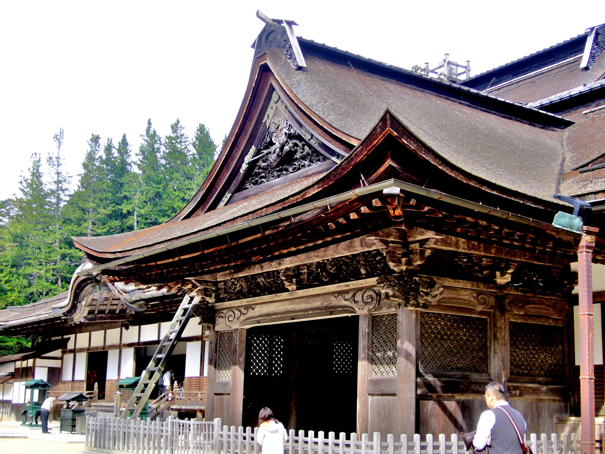 主殿は火災による焼失のため幕末の1863年の再建で、東西約60m、南北約70mの壮大な建築。高野山は山上のためたびたび落雷による火災で消失してきました。檜皮葺きの大きな屋根が壮麗な曲線を描き、の上には雨水を貯めるためのが天水桶置かれています。堂内の廊下には、梁は水にまつわる海老のように湾曲した海老虹梁と呼ばれるもの、その手前に橋の欄干、廊下を水路に見立てることで火災を防ぐ願いが込められています。