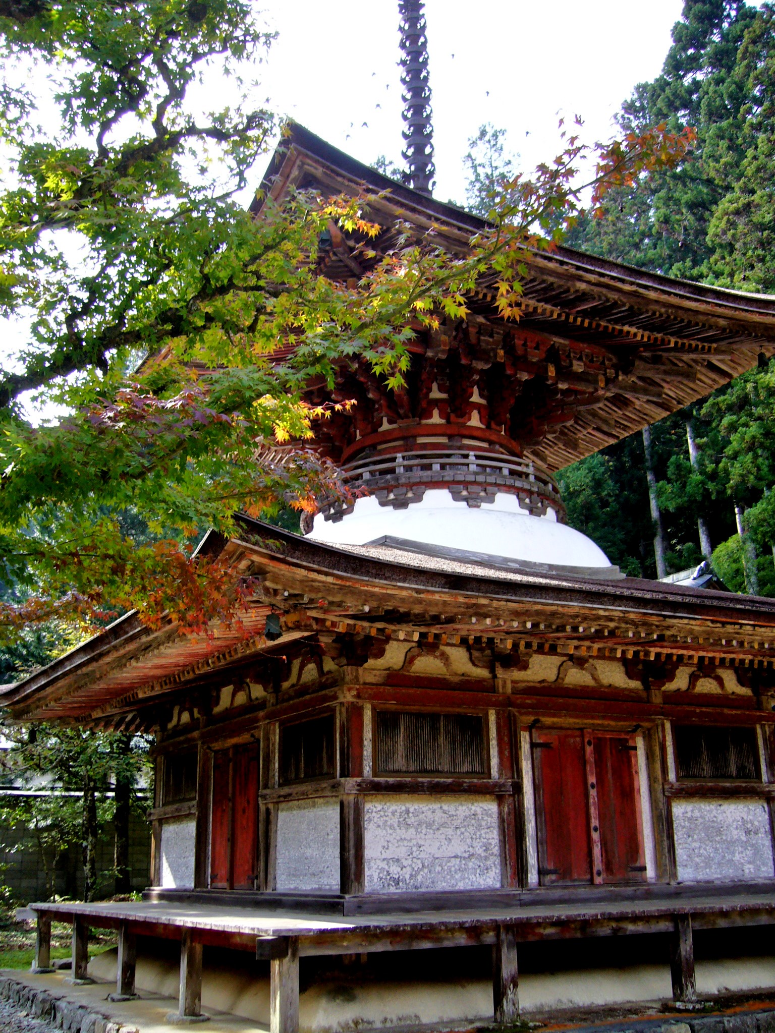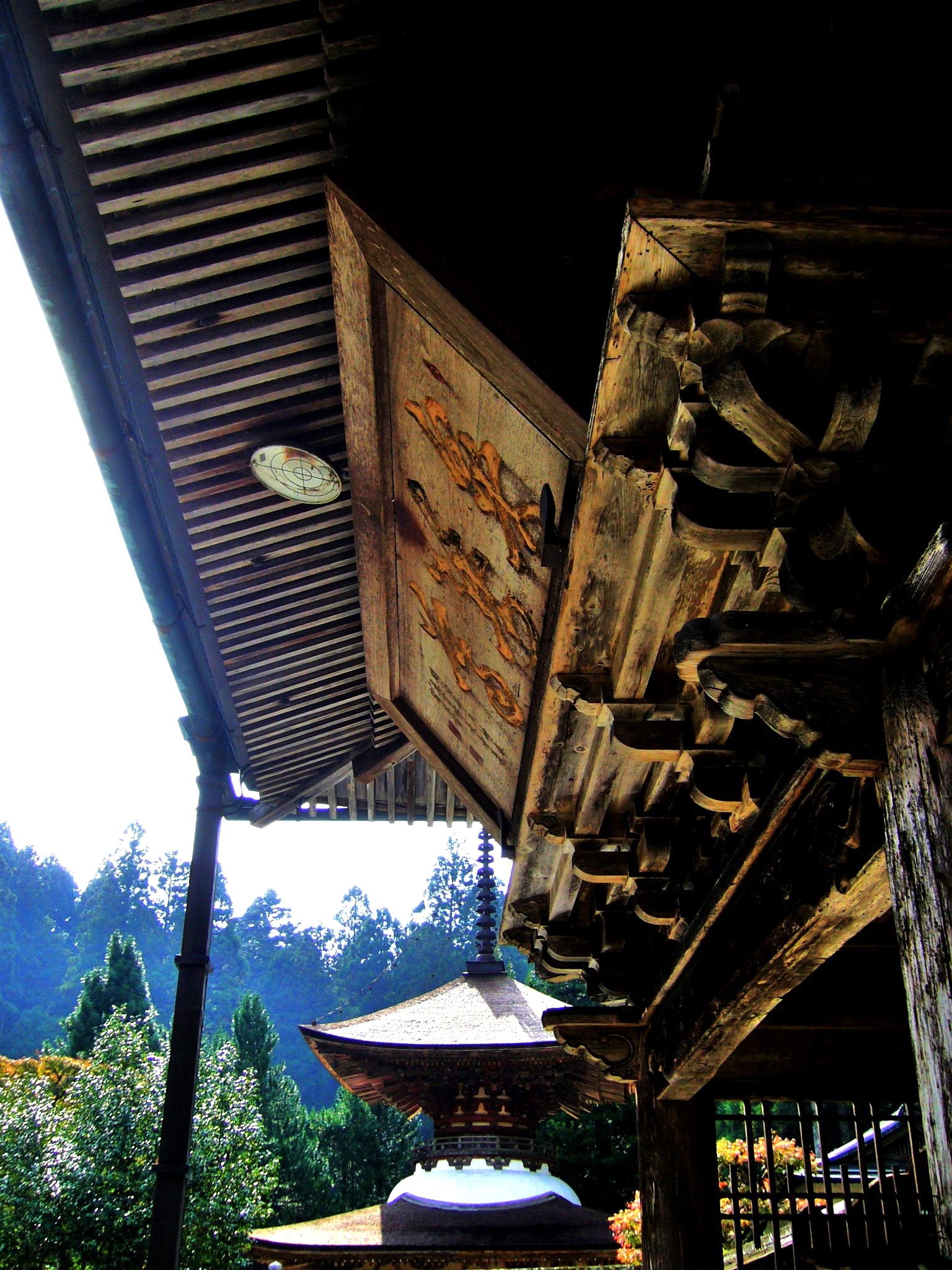 金剛峯寺のひとつ先のバス停が千手院橋です。ここでメインストリートから少し右に道をそれて、国宝の多宝塔がある「金剛三昧院」に立ち寄ってみましょう。この道は高野山と熊野本宮大社を結ぶ道「熊野古道・小辺路」の入口でもあり、大滝口女人堂跡に通じています。