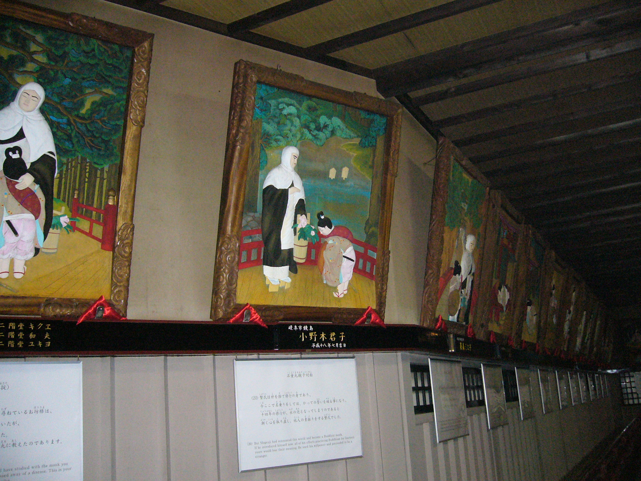 もとに戻って「奥之院」方向に歩くと「苅萱堂」が目に飛び込んできます。苅萱道心(等阿法師)が出家して実の子石童丸(信性法師)と父子の名乗りをあげないまま四十年の長き期間、仏道修行に明け暮れたというの悲しい物語ゆかりのお堂で、当時女人禁制の高野山の掟により母を山麓の学文路の宿に残し、父を探し求めて登山した石童丸の帰りを待ちきれず亡くなった母の悲劇と共に壁面には石童丸伝説にちなんだ絵画が掛けられ、しばし物語の世界に誘われます。