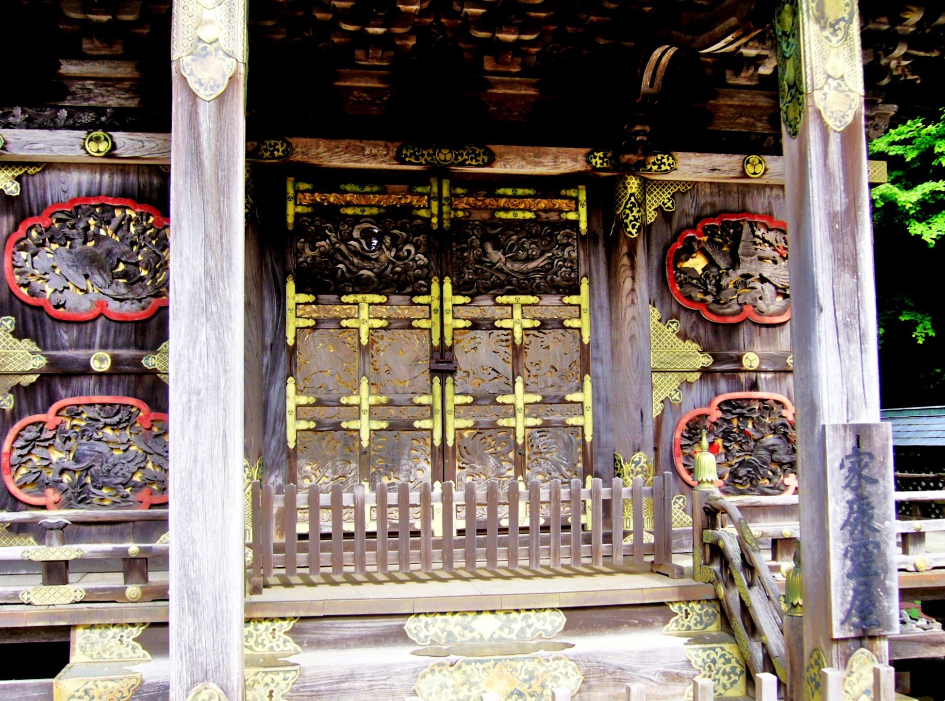 向かって右が家康霊屋、左を秀忠霊屋と呼称する三間四面の一重宝形造の建物は、東照宮形式として他所の見る事の出来ない特異な白木造りの外観。金銀箔を押した極彩色の厨子は細部まで彫刻や金具などの装飾に飾られています。家康の方には東照大権現という神様として崇められている為なのか、鳥居が置かれていますよ。(拝観料200円)