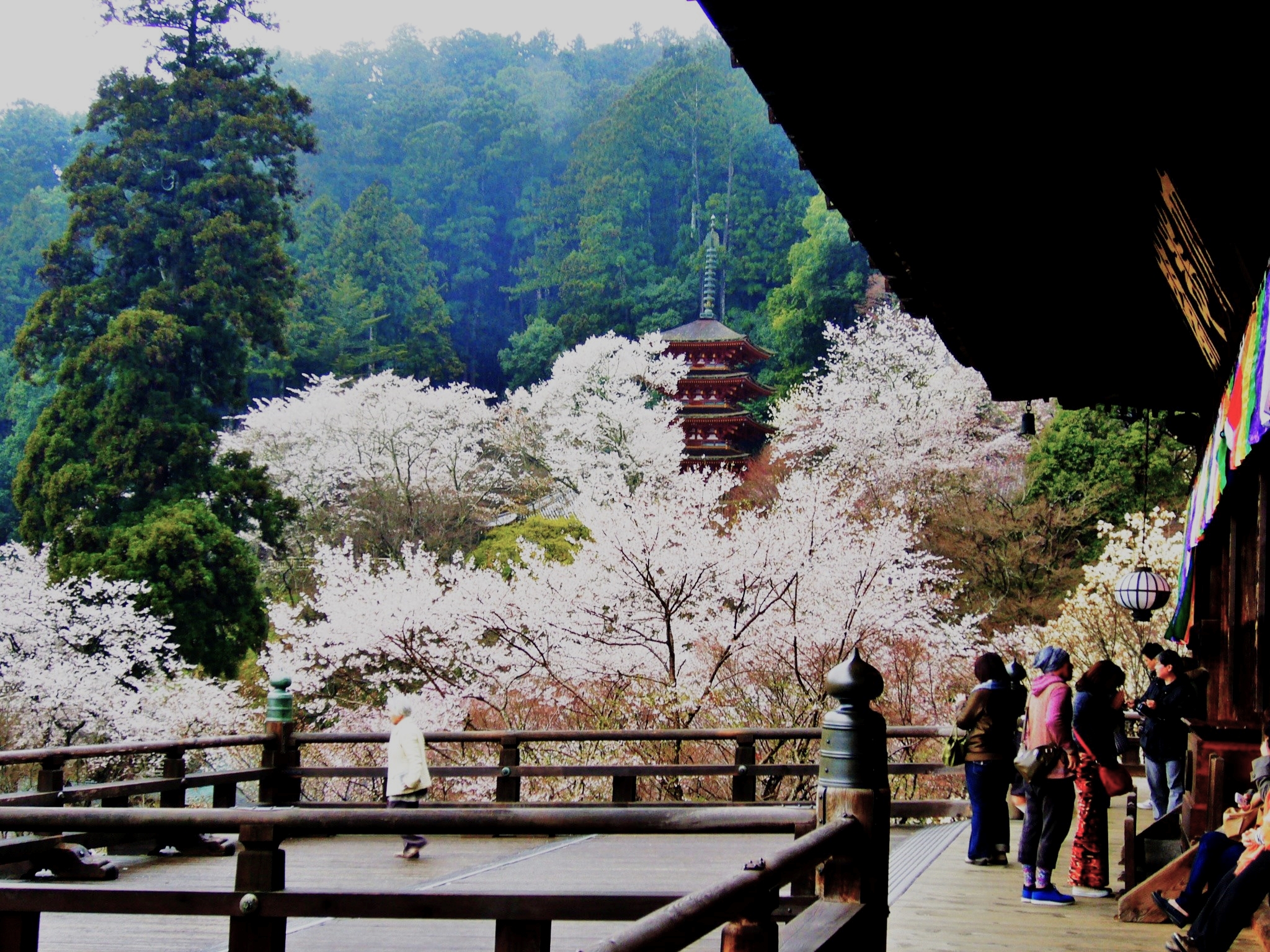 本尊・十一面観音菩薩立像を安置する舞台造りの本堂、昭和29年(1974)戦後日本に初めて建てられた「昭和の名塔」の誉れ高い、朱塗りの塔身に金色の相輪が輝く五重塔に映え、薄紅色に包み匂うばかりである。眺める位置でそれぞれに趣を異にして咲く桜を存分に満喫できるまさに「花の御寺」である。古の都人達もさぞや一瞬の白昼夢を見てしまう心地よさであったろう。