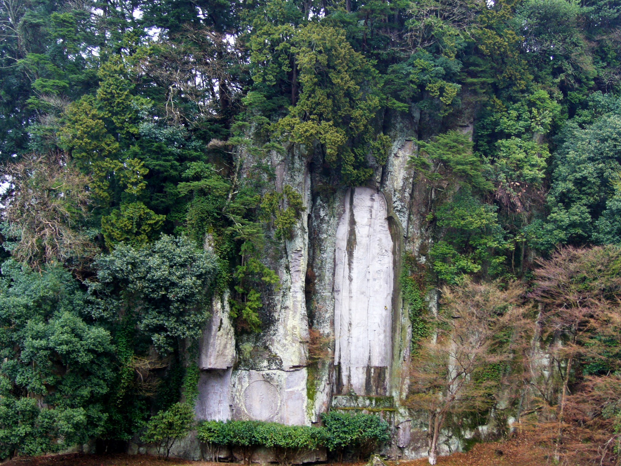 大野寺境内の遥拝所に立つと、弥勒菩薩立像を真正面から拝することができます。承元元年(1207)に後鳥羽上皇の勅命により笠置寺本尊の弥勒磨崖仏を模して彫られたといいます。承元2年(1208)に完成、翌年には上皇の行幸を仰いで盛大な開眼法要が行われています。大野寺の縁起によると、上皇は自身や縁者の名をしたためた願文を像の中に納めたと伝わります。