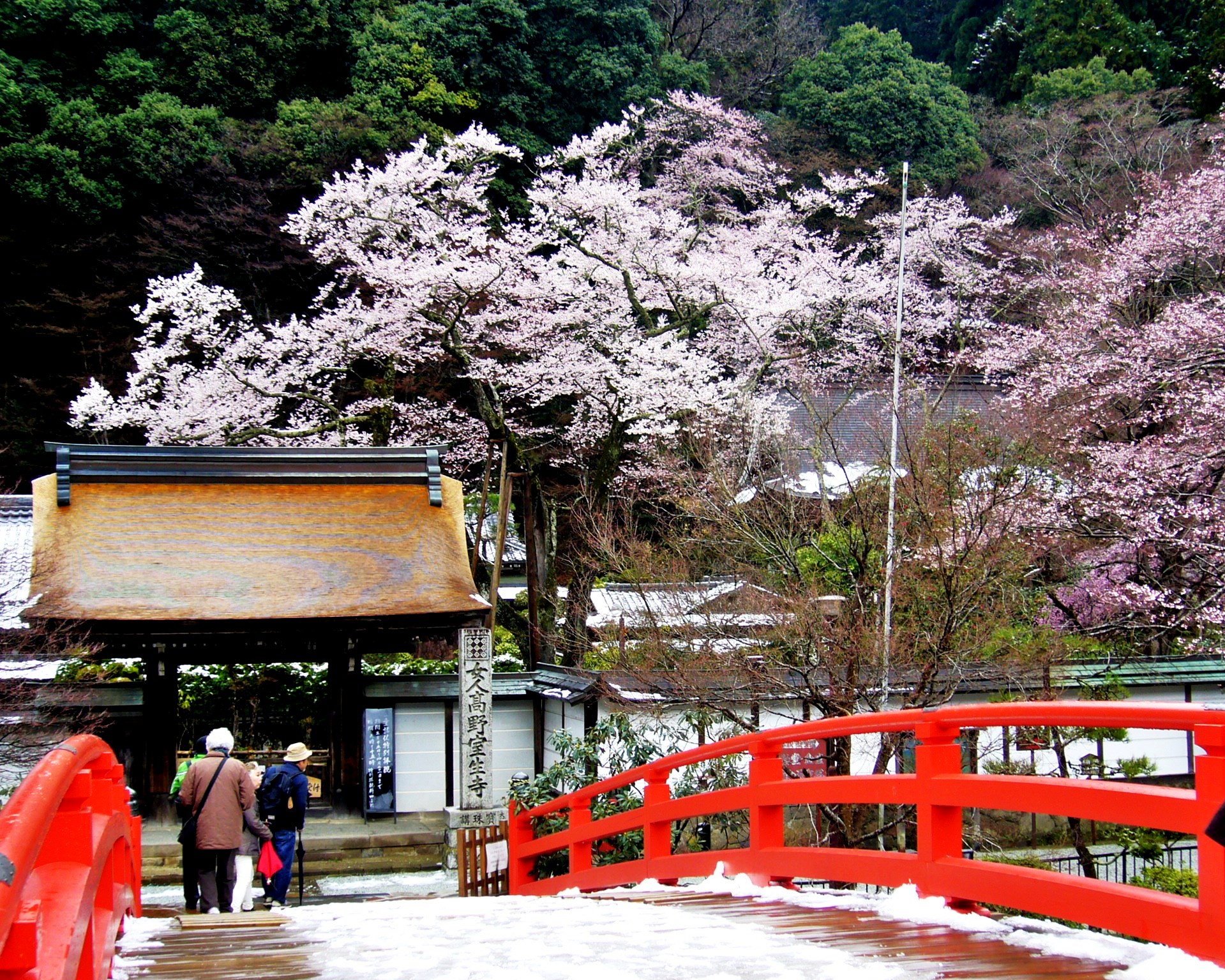 室生寺もまた桜の名所です。奈良時代末、東宮(後の桓武天皇)の病気平癒を願った興福寺の名僧賢憬が創建。一説には天武天皇の発願により役行者が創建し弘法大師が再興したとも伝えられ、空海の開いた女人禁制の高野山に対し、女性の参詣を認めたため女人高野と呼ばれる。石楠花に代表される花の寺としても有名ですが、この時期、門前に架かる朱塗りの太鼓橋から表門を望む風景は絶好の撮影ポイントで、春ともなると女人高野に相応しく優美な山桜や薄墨桜を正面に望む満開の桜は絵になる風景です。いつもながら味わい深い門ですが、背後に桜があると一段と素敵になります。表門の奥にある護摩堂の前には「乙松桜」と呼ばれる紅ヒガンザクラがあり、こちらも見応えがありますよ。