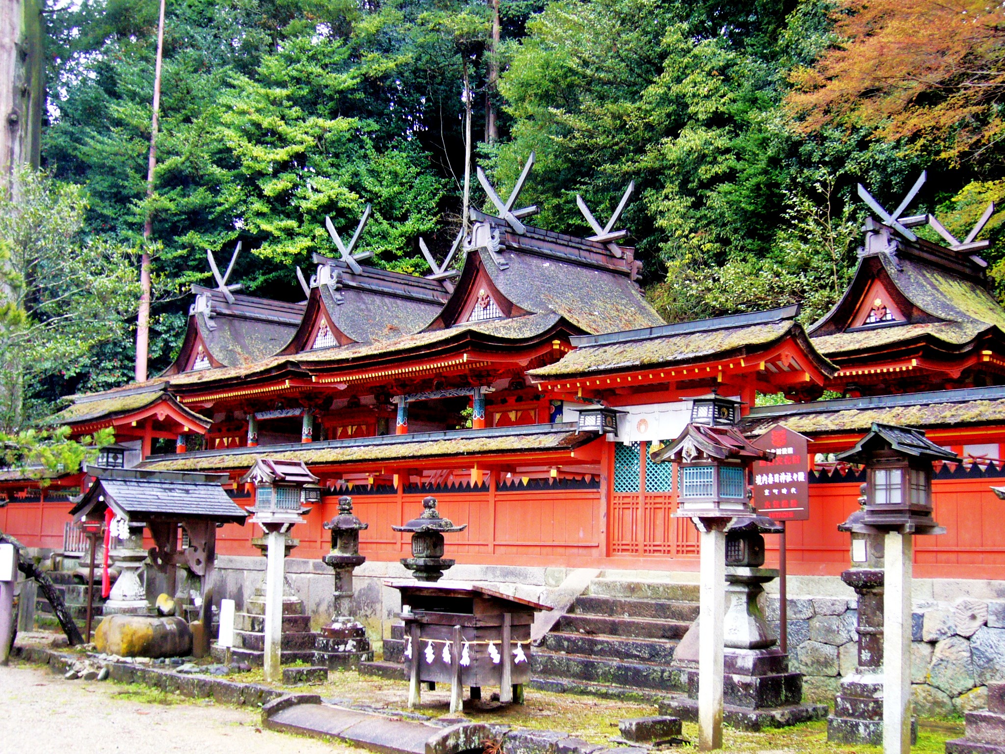 宇太水分神社」は宇陀市の屈指の大社で水の配分を司る神である速秋津彦神・天水分神・国水分神の水分三座を祀る。創社は崇神天皇の時代にまでさかのぼるといわれる古社です。大和の式内社の水分神社は、大和の東西南北に祀られ、東に当たるのがここ宇太と葛城、吉野、都祁の4社だけです。緑に包まれた鎌倉時代の本殿(国宝)は一間社隅木入春日造水分連結造の古型で外部の朱塗り部分には極彩色が施されている。