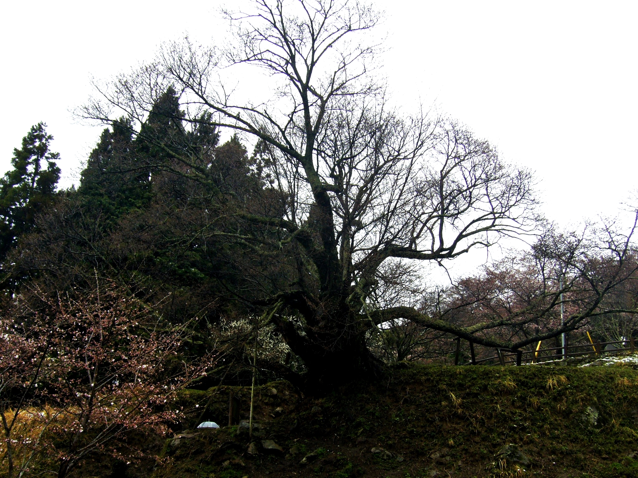 大河ドラマ「葵徳川三代」のオープニングに登場して注目されるようになった樹齢300年、幹回り約3m、高さがおよそ13mの堂々とした一本桜はとにかく美しい。山が迫る田園風景の中、萌え出す足元の草と背景をなす木立の緑、華を添えるように立つ桜の石垣から飛び出したように垂れる枝は力強く、その周りには約50本の深紅の桃の花と黄色の菜の花を従え、桜と桃、濃淡の異なるピンク色の二種の共演が描く風景はただため息をつくばかりの美しさです。