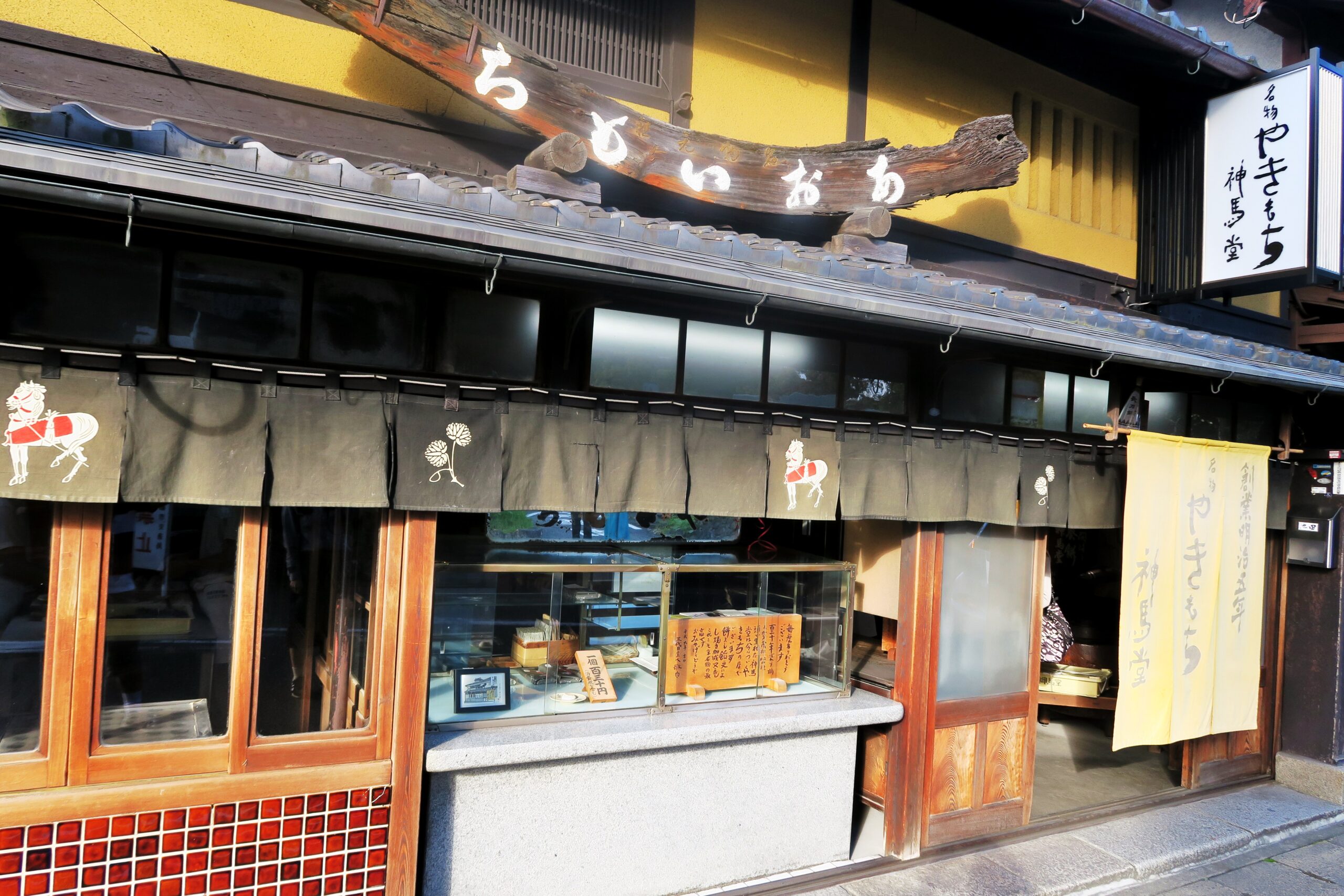 上賀茂神社の門前菓子である「やきもち」の人気店が2店あります。やきもちの正式名称は葵餅といってもともと上賀茂神社で毎年5月に開催される京都三大祭のひとつ葵祭で食べられていたものです。神社西側の参道と鴨川に挟まれた道路沿いにあるのが「神馬堂」です。歴史と風格があるお店で、山吹色の暖簾をくぐって店内にはいると囲炉裏があり、店名の由来であろう神馬が飾られています。