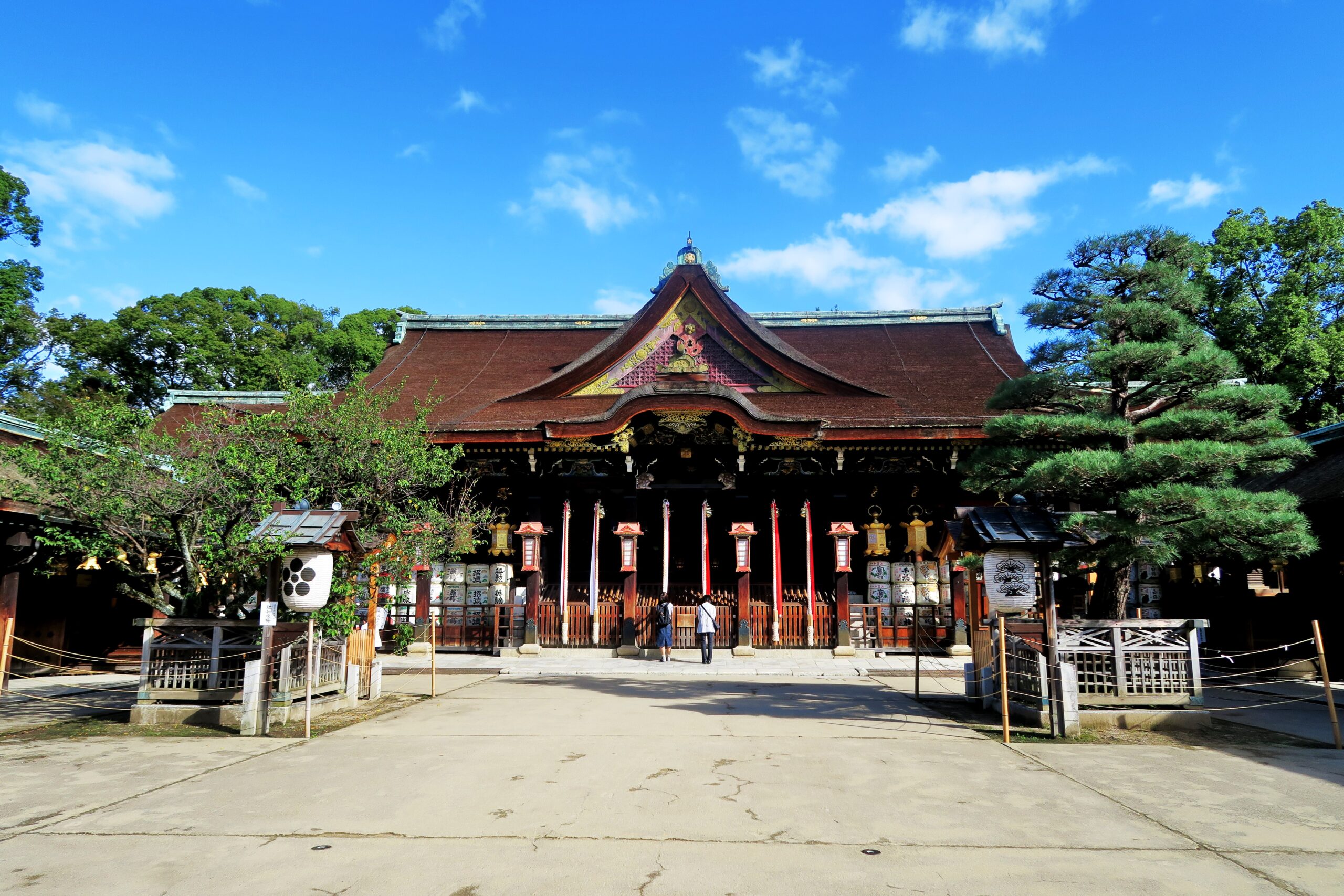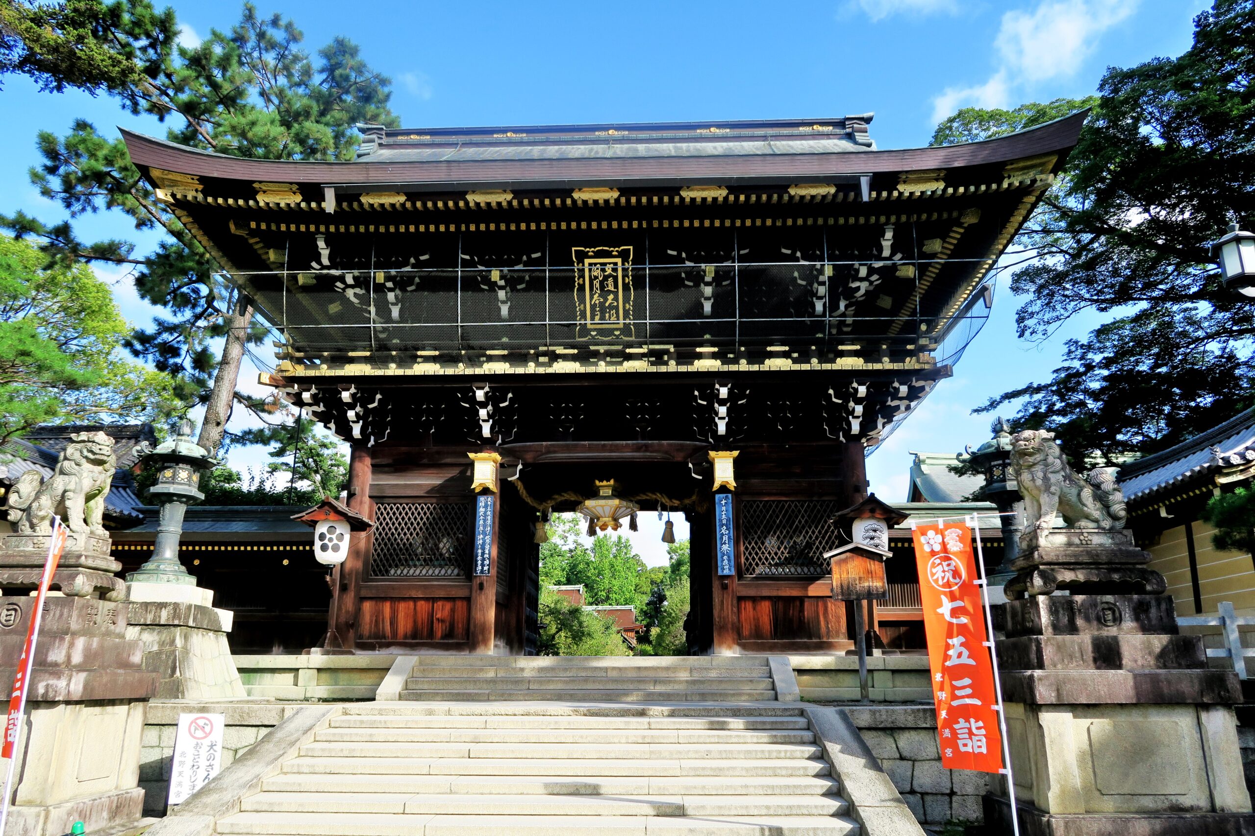 この社は幼い頃から勉強熱心で最年少で国家試験に合格し、右大臣にまで上り詰めた学問の神様で知られる菅原道真公をお祀りする、全国のおよそ12000社あると言われる天神様、天満宮の総本社である。楼門をくぐるも本殿は参道の正面になく「筋違いの本殿」といわれ、もとの地主神社があるため横にずらして本殿が建てられたためです。