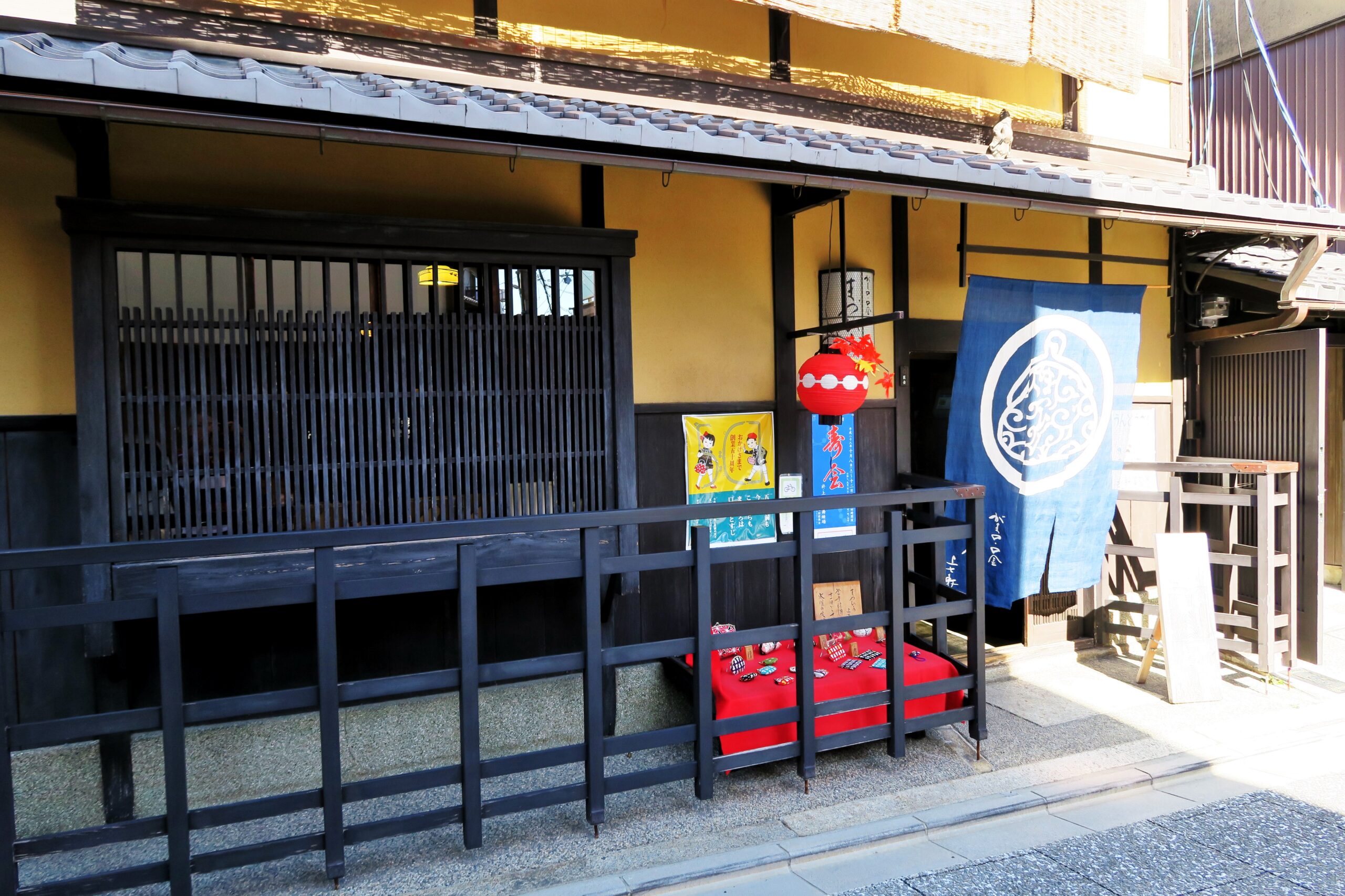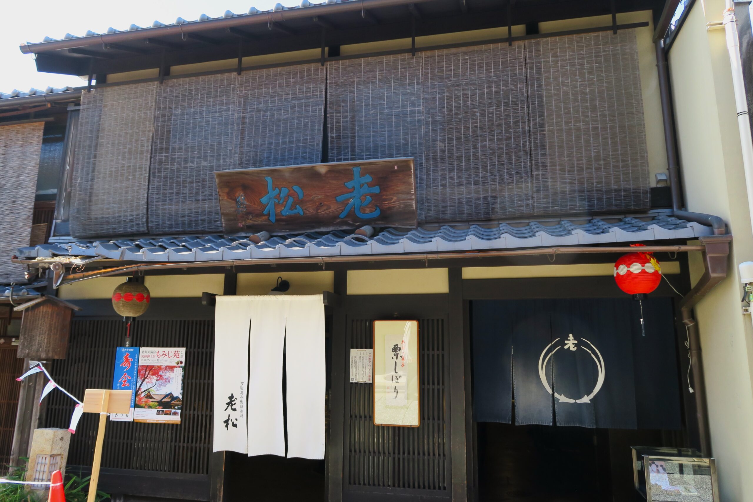 通り沿いには餅屋ではありませんが、上七軒で明治41年(1908)創業の和菓子屋「有職菓子御調進所 老松」があります。当主の家系が平安時代の宮廷祭祀官の流れを汲み、古来より朝廷に伝わる有職故実に基づく儀式・典礼に用いる菓子、茶道に用いる菓子を手掛けてきたことから、屋号を有職菓子御調進所としている。格子戸にかかる白い暖簾が映える町屋建築。その店構えからも老舗の風格が伝わってきます。