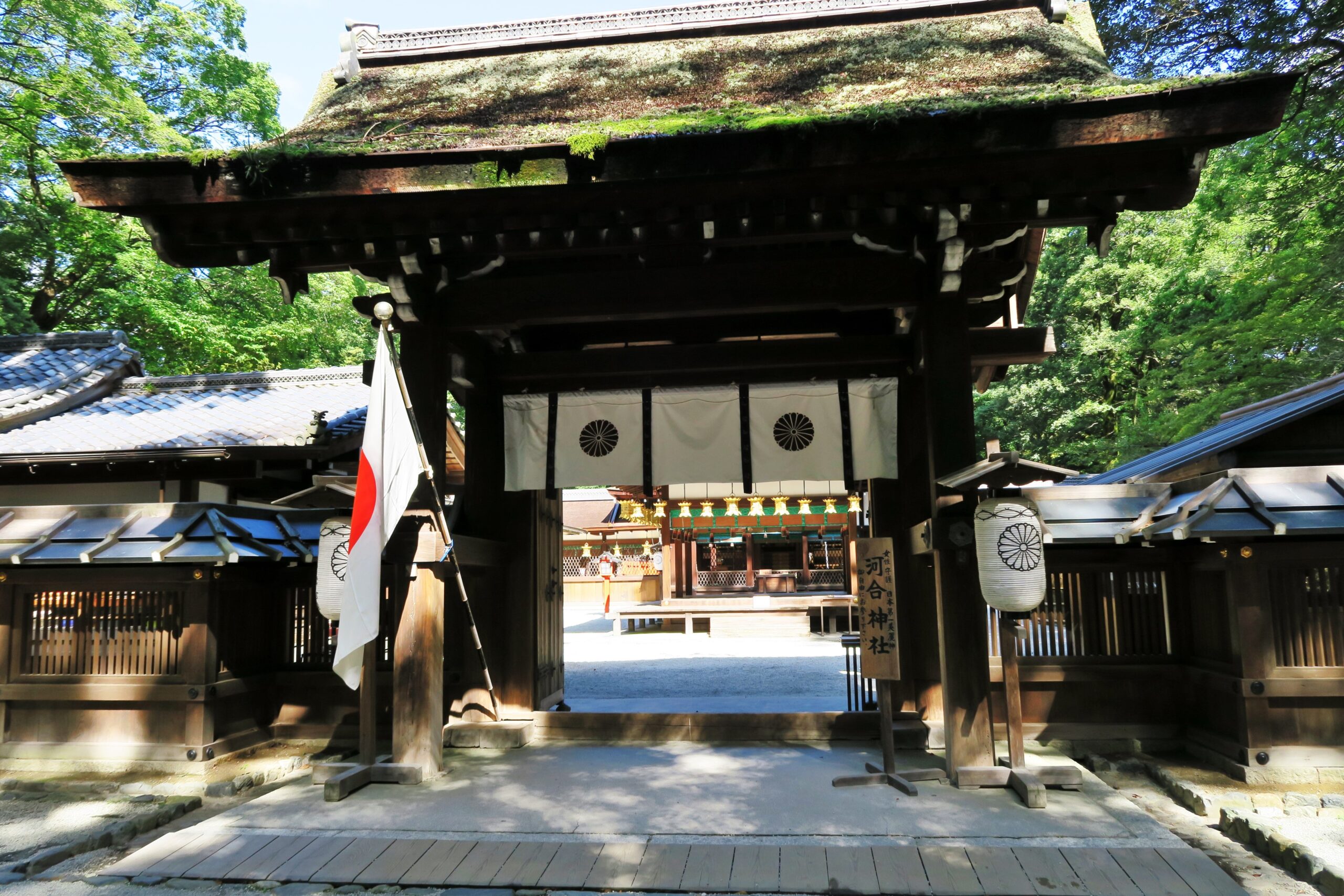 糺の森の南側に位置する「河合神社」は、古くから下鴨神社本宮に次ぐ大社として歴史に登場し、今数多いパワースポットでも注目度が赤丸急上昇中の神社です。その理由は、中門の看板に記されている「女性守護 日本第一美麗神」の文字が。御祭神の玉依姫命に因み、女性の守護神として信仰されていて、美麗祈願の「鏡絵馬」と呼ばれる、手鏡形の絵馬が有名なのです。