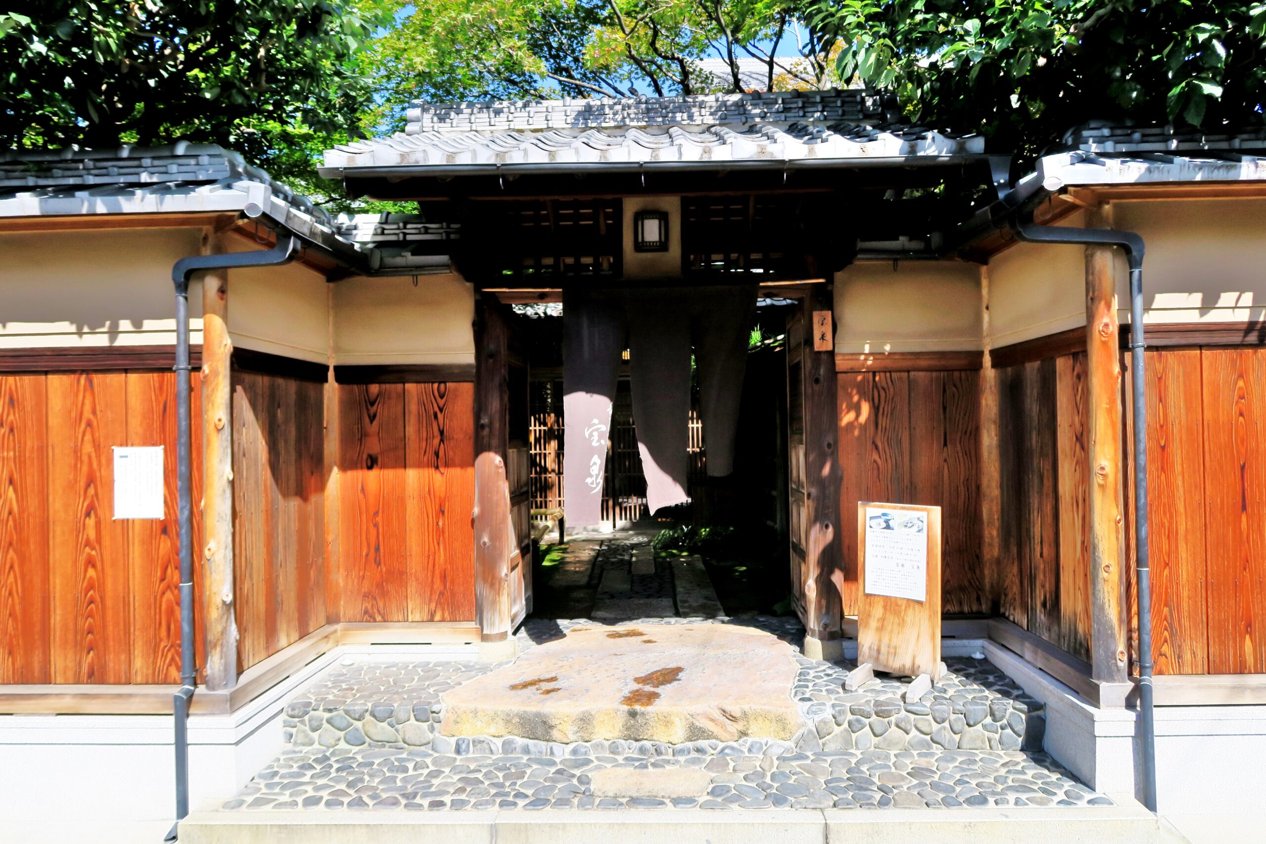 世界遺産である下鴨神社と北大路通りとの間、松ヶ崎の閑静な住宅街の一角に一際見事な門構えの日本屋敷が現われる隠れ家的なお店が「茶寮 宝泉」です。わらび餅とは何たるものかを教えてくれるお店で、市販の物とは比べることのできない格の違う日本一の「わらび餅」がいただけます。世界遺産「下鴨神社」から歩いて10分かからないくらいの場所にあるので下鴨神社参拝と併せて行動予定に是非組み込んでみてください。木造りの門に暖簾がかかり、その先には石畳が敷かれた小径があり、いきなり京都感を存分に味わえる予感が高まる良い雰囲気です。
