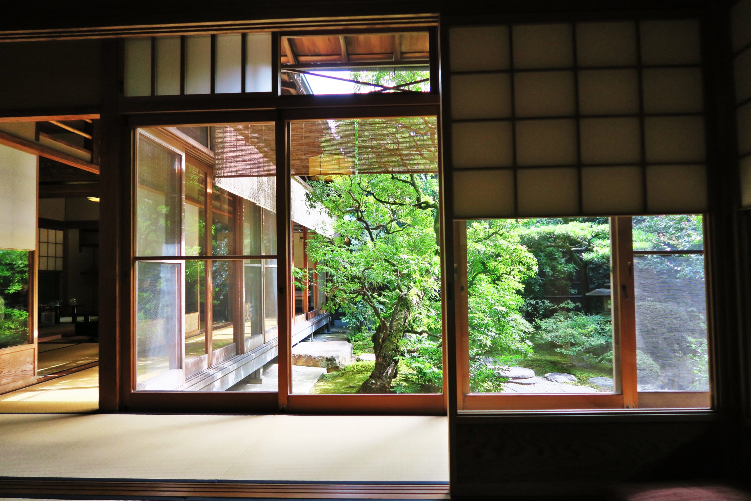 店内のどこの席からも日本庭園が楽しめるように配慮された、ローテーブルが置いてあるいくつかの部屋があり、店員さんが案内してくれる席に着席します。お部屋には掛け軸や生け花が床の間に飾られ、注文した品が出てくるまでの間、窓越しに見える美しく整った日本庭園を眺めていると穏やかな気持ちになっていきます。築100年以上の歴史ある純和風の造りの建物は手入れが行き届いていて、古き良き京都の凛とした空気が漂い、とても居心地の良い時間が過ごせますよ。