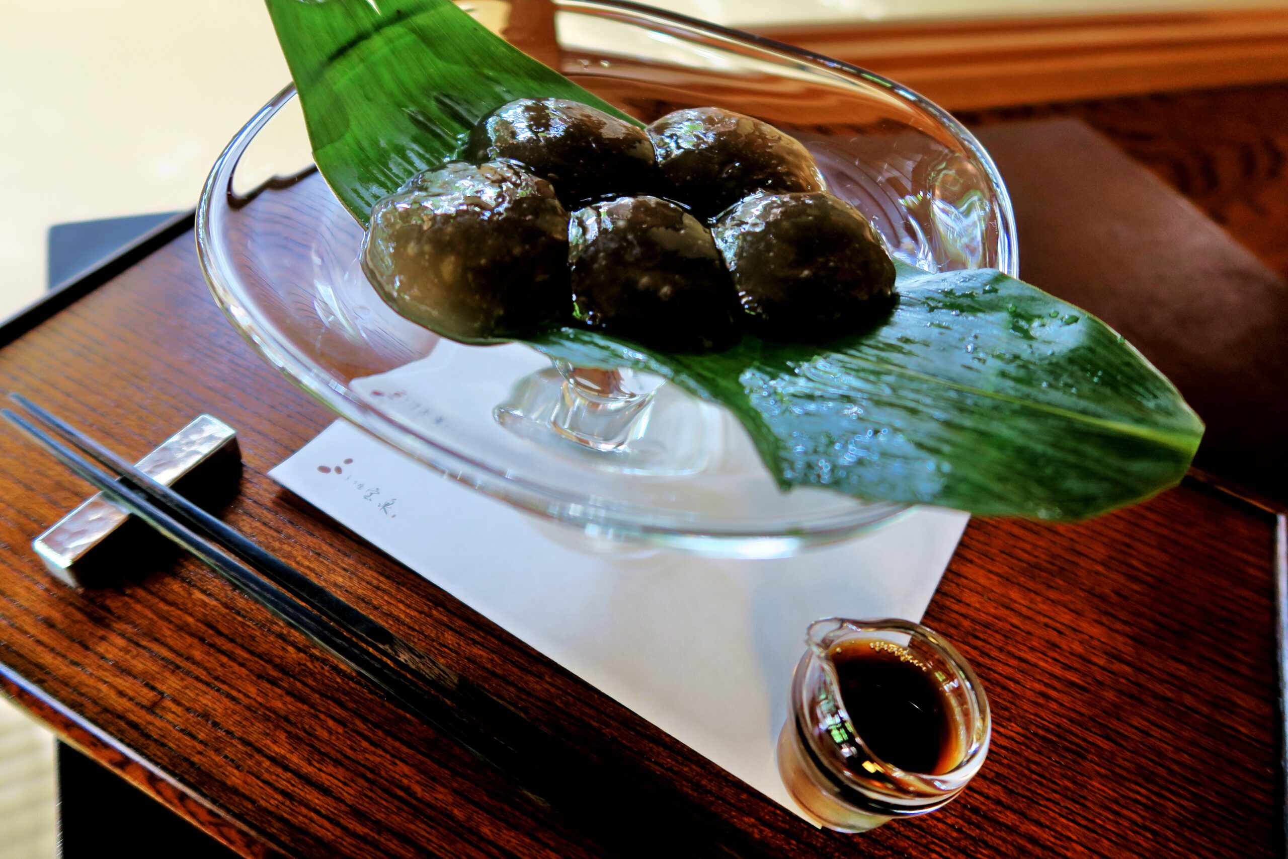 「茶寮 宝泉」で一番人気の「わらび餅」は透明なガラスの器に笹が敷かれ、その上にわらびもちが5個、そして黒みつが添えられています。一粒ずつが大きく、表面は透き通っていますが全体的に黒みを帯びています。できたてのわらび餅というのは黒みがかっているとのことで、出来たてを時間をかけずに食べていただきたいとのお店の方のお話でした。ひと口めはそのままに、あとはお好みで沖縄産黒蜜をかけていただきますが、本当のわらび餅とはこれか!と唸るほどの美味な極上の一品です。箸で持ちあげるとぷるぷるとした感じですが、食感はもちもちとして弾力が強く、サクっとした歯ごたえもあり、甘さも絶妙で黒蜜をかけないほうがより「茶寮 宝泉」の「わらび餅」を実感できます。