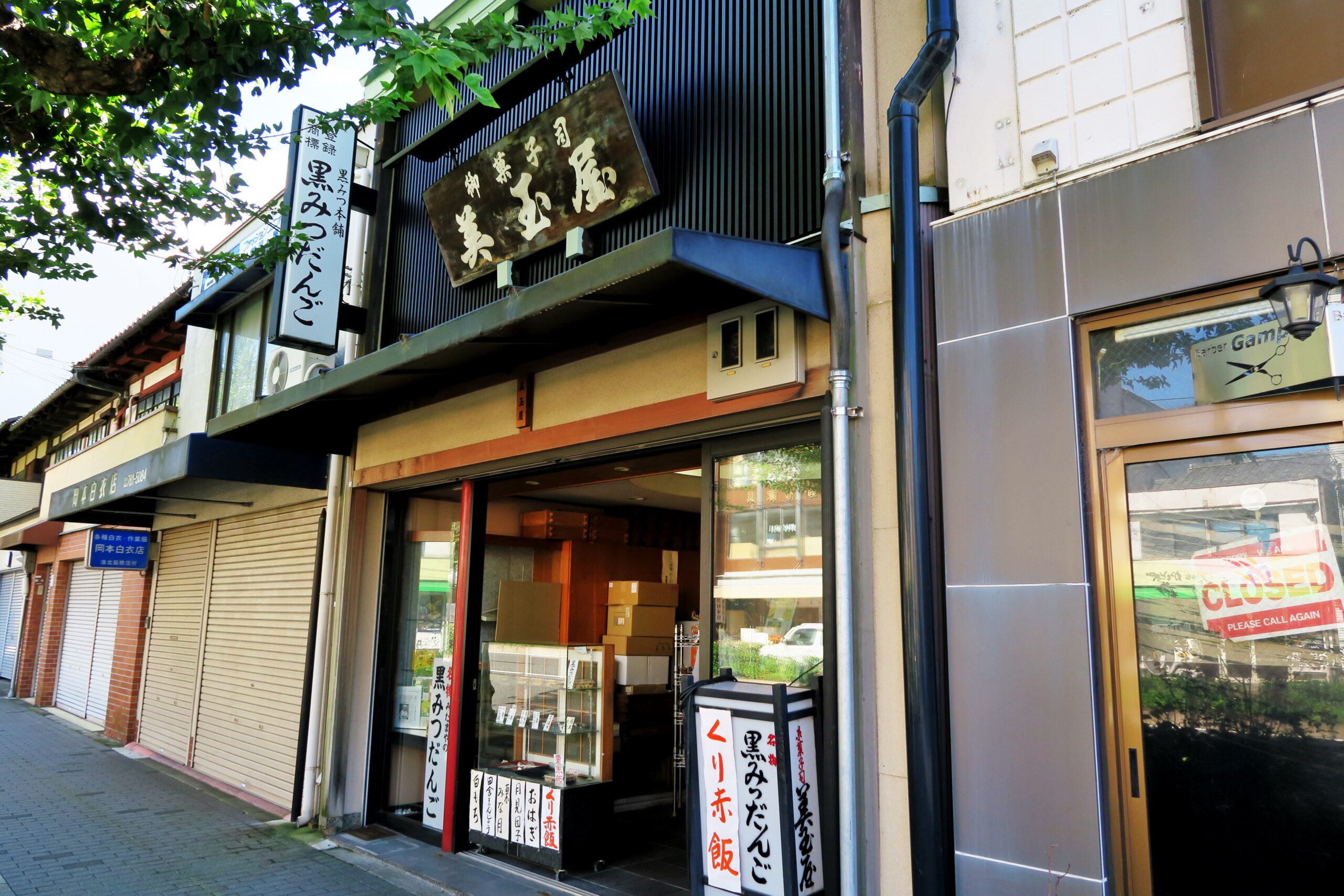 茶寮 宝泉から先、さらに北に上がった通り沿いにお持ち帰り専門の和菓子店、黒みつだんごの「美玉屋」があります。