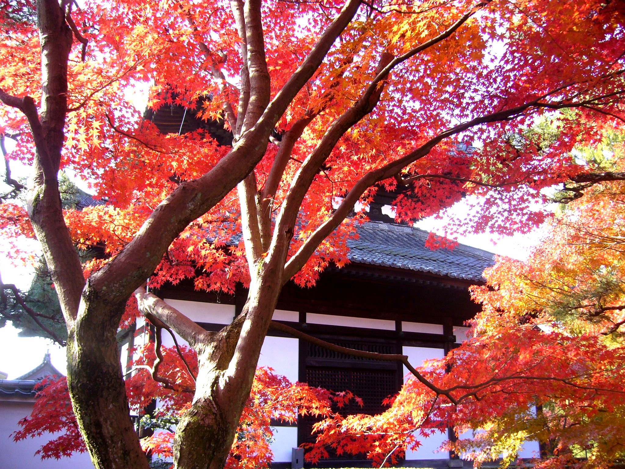 実は600年前まで、この一帯には桜が植えられていました。寺の画僧・明兆の大涅槃図を室町幕府4代将軍足利義持が気に入り、褒美をとらせようとたところ、後世、遊興の地としてにぎわう桜は修行の妨げになると、境内の桜の木をすべて伐採してほしいと答えたそうです。その後もみじに植え替えられたと言い伝えられています。それが上記のキャッチコピーです。エピソードが美しい糸になり、いっそう、季節に映える錦秋を織りあげているのかもしれません。