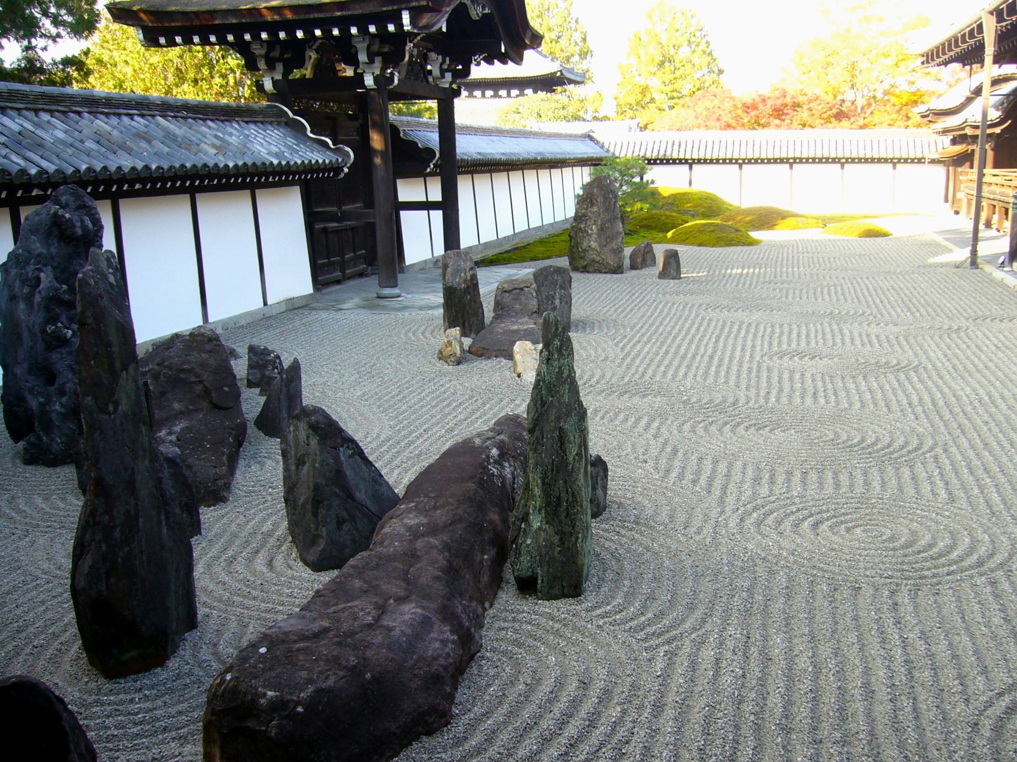 方丈庭園の拝観は、庫裏で受付をし庫裏と方丈を結ぶ渡廊下へと向かう。庭に入るとすぐに目に留まるのが、渡廊下の左手にある広さ210坪の枯山水庭園である南庭です。古来中国大陸の蓬莱神仙思想では、東の大海の彼方に仙薬財宝があると信じられた仙人が住む「蓬莱」「方丈」「瀛洲」「壷梁」と呼ばれる「四つの神仙島」をモチーフに、渦巻く幾何学模様の砂紋によって「八海」を表し、そこに立つ力強い石組みは不老不死の仙人が住む島を表しています。奥の苔山で京都五山を表現してモダンな空間に。また正面に建つ向唐破風の表門は昭憲皇后の寄進と言われ、明治期唐門の代表作です。