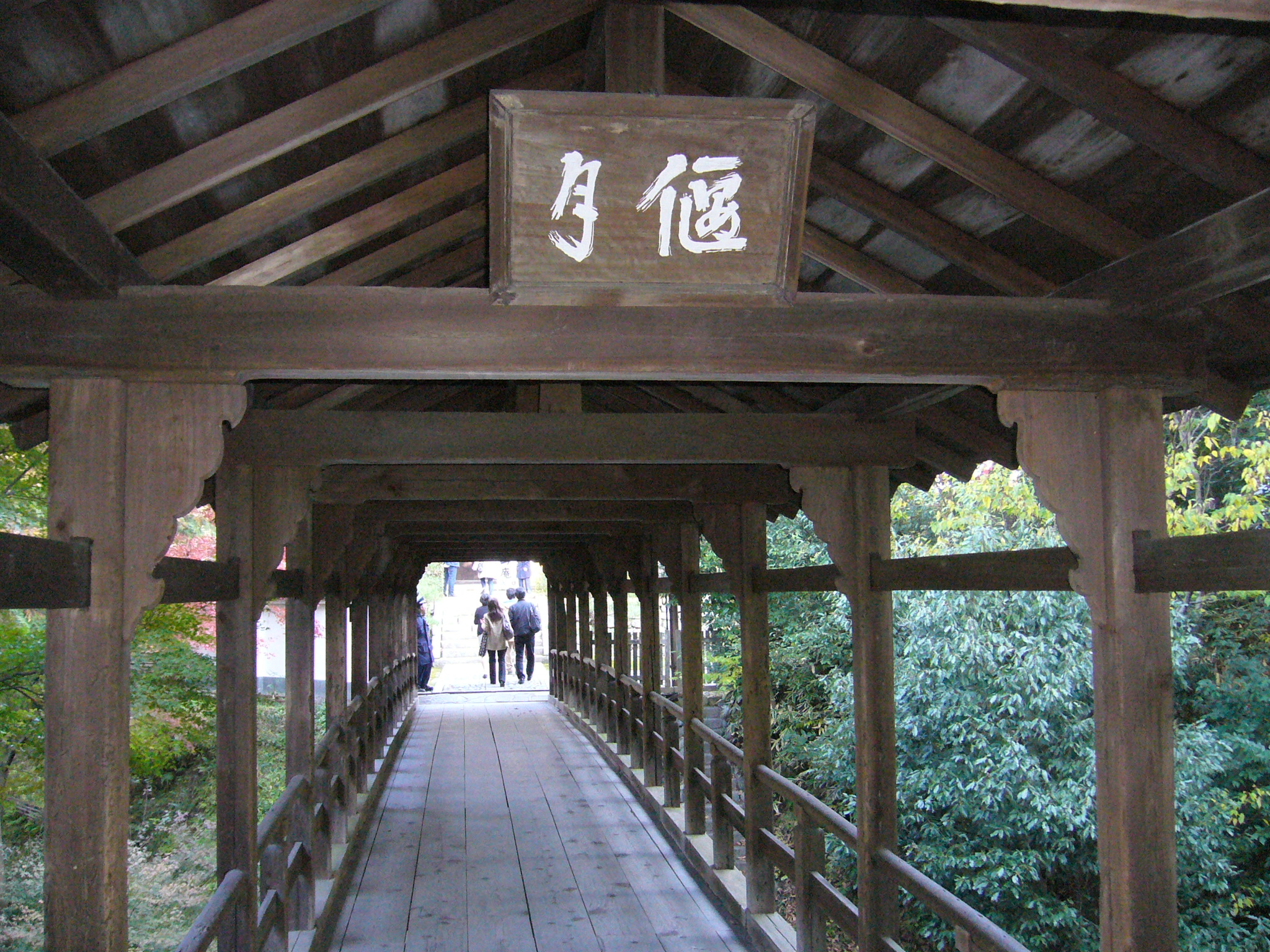 本尊は釈迦如来。本堂は昭和9年再建、三門は日本最古の三門で国宝。現存する最大で最古の禅堂、浴室、東司(とうす)、愛染堂など重文の建築も多い。方丈庭園は昭和の作庭家、重森三玲による。750年の歴史を脈々と伝える東福寺は京都屈指の紅葉の名所として知られ、広大な境内に大伽藍が勇壮な甍を並べて佇む景観は、時空を越えた別天地のようです。数ある京都の紅葉名所のなかでも、No1に挙げる人が多いのが、この寺の仏殿から開山堂を結ぶ、通天橋からの眺めです。眼下に本堂と開山堂をゆるやかに隔てるように、三の橋川が流れ、一帯の渓谷は洗玉澗といいます。通天橋は東福寺の一番高い場所にある回廊、紅葉が炎のように燃える渓谷に浮かび上がったように天へと通じているようです。橋の中央部には張り出しがあり、今や東福寺の紅葉を鑑賞する特等席です。そもそもは、谷を登り降りして上の開山堂へ向かう修行僧を助けるために、架けられたものだそうです。ここからの眺めは絶景です。