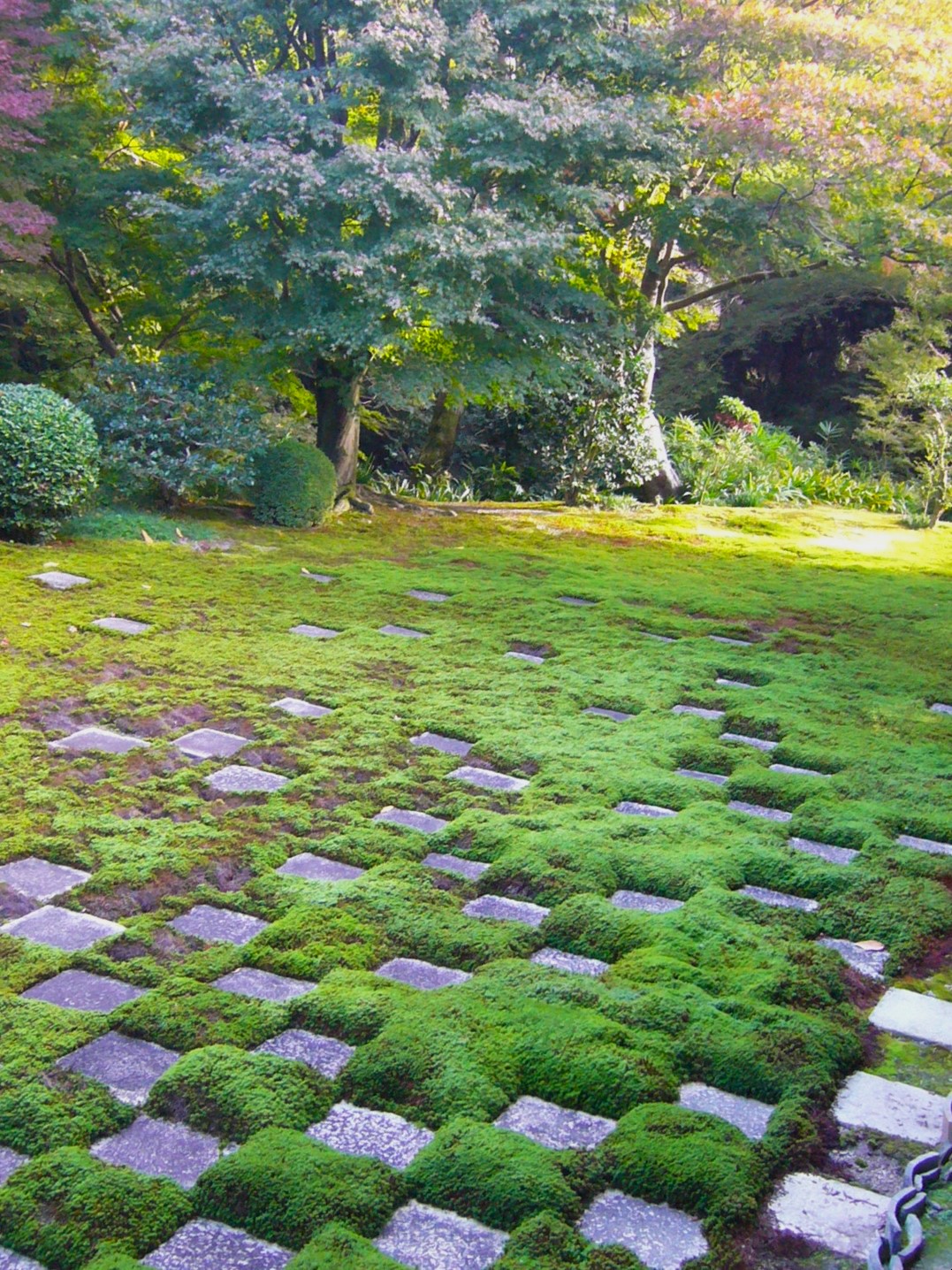 北庭で西庭から受け継いだ市松模様が細かくなり、そして一つずつの石が徐々に東北の谷へと消えていく。釈迦の入滅までを表したもので、最初は規則性のある市松模様が、どんどん崩れていき散り散りに。対して苔の面積が増えてゆくグラデーションは、日本画のぼかしのようです。より刻みのあるウマスギゴケの緑との対比も色鮮やかな市松模様の敷石はサツキの丸刈りとの調和の妙も印象深く、彫刻家・イサムノグチはこの庭を「モンドリアン風の新しい角度の庭」と評しました。背景の紅葉の赤色と唐楓「通天紅葉」の黄金色とが織り成す色彩感あふれる空間となっている。