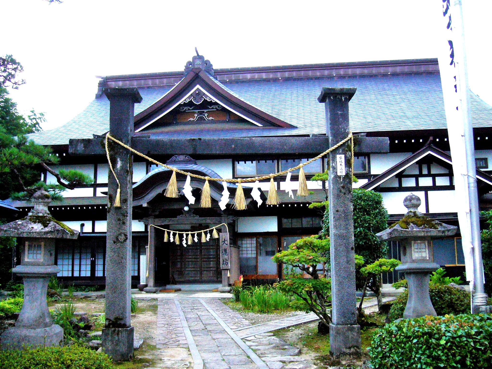 道路を挟んだ左右に「○○坊」「××坊」と大書した看板と、冠木門を構え、軒先に注連縄を張った家々が並んでいて、建物は一種独特な構えで、神社のようでもあり、寺のようにも見え、旅館のようでも、あるいは普通の民家のようでもあります。坂をかなり上のほうまで登った先を左に曲がると出羽神社参道である。宿坊と呼ばれる宿泊施設はもともと修験道の講を取り仕切る神官や修験者の家だったものが、現在は旅館業に近い営業形態になっているとのこと。羽黒山の講は箱根から東、関東以北の33ヶ国を布教の場と定め、宿坊それぞれの受け持ち場が決められていて、その地域を「霞場」といいます。そこで集まった信者は講をつくり、出羽三山を参詣するときには、特定の宿坊に泊まるのです。箱根から西は熊野とか大峯山に行くといい、西の伊勢参りに対して「東の奥参り」と言われました。因みに写真の「大進坊」は約350年の歴史を持ち、千葉県東部に霞場を持つ宿坊とのこと。路地、松、黒塀、鳥居、宿坊、そして清々しい空気と、手向には独特の空気が流れています。