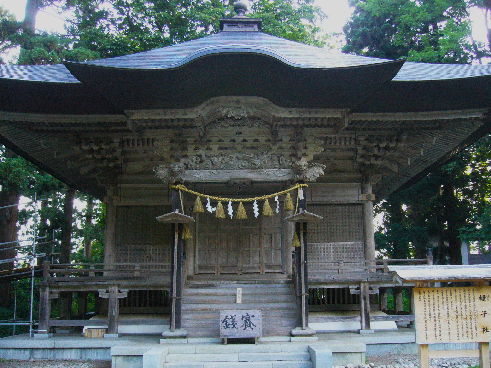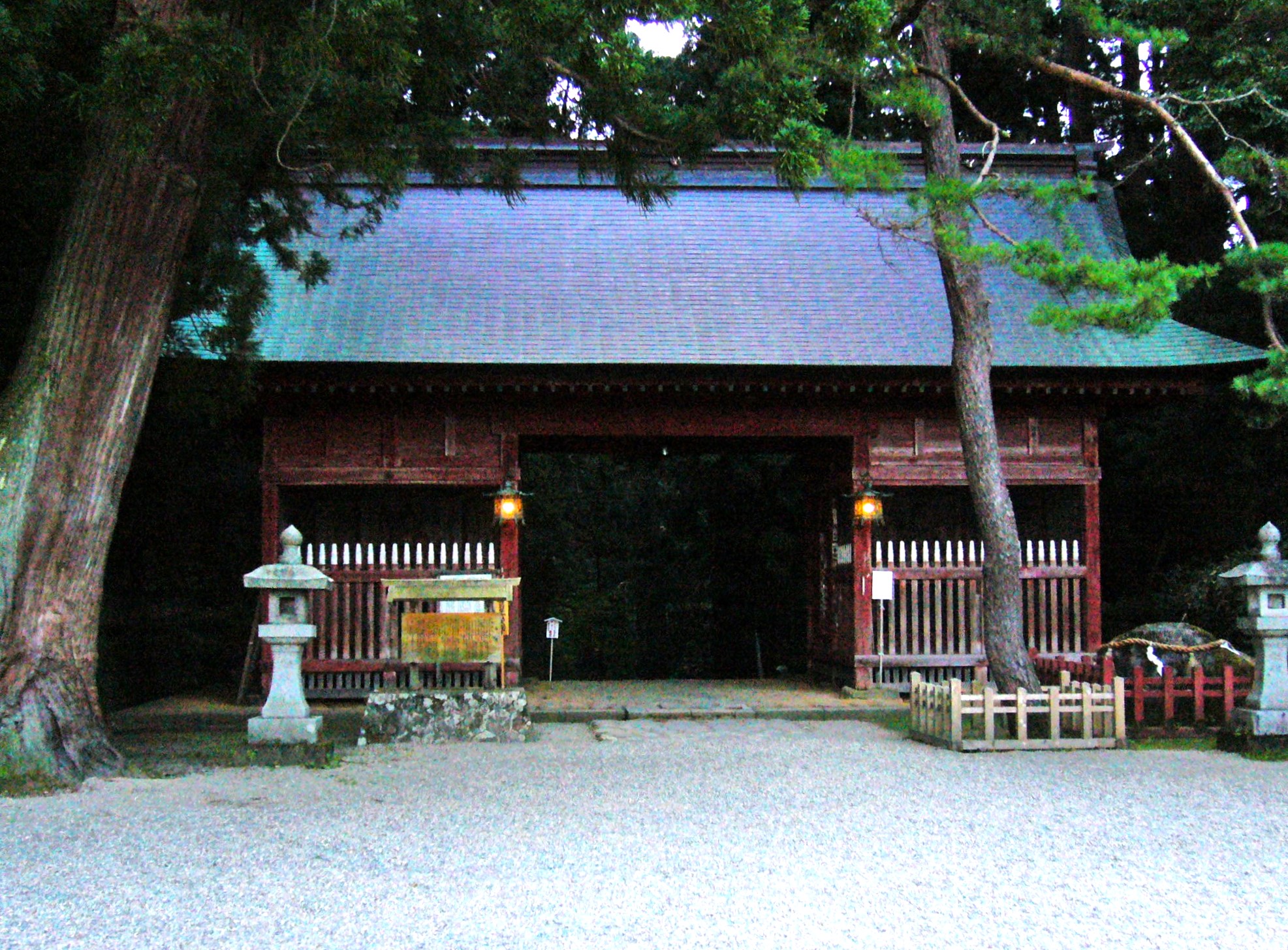 池の東側に建つ切妻造り萱葺の鐘楼は、最上家信の寄進によって元和4年(1618)に再建されたものであす。鐘は建治元年(1275)の銘があり、古さと大きさでは日本有数の古鐘です。本殿前の鏡池の龍神伝説によると蒙古襲来(文永の役)の折に、鏡池に棲む龍神に鎌倉幕府が撃退を祈願したところ、龍神の力で神風が吹いて敵艦船を海中に覆滅し、蒙古軍が壊滅したとして、祈願の成就に対して、鎌倉幕府が奉納した大鐘です。