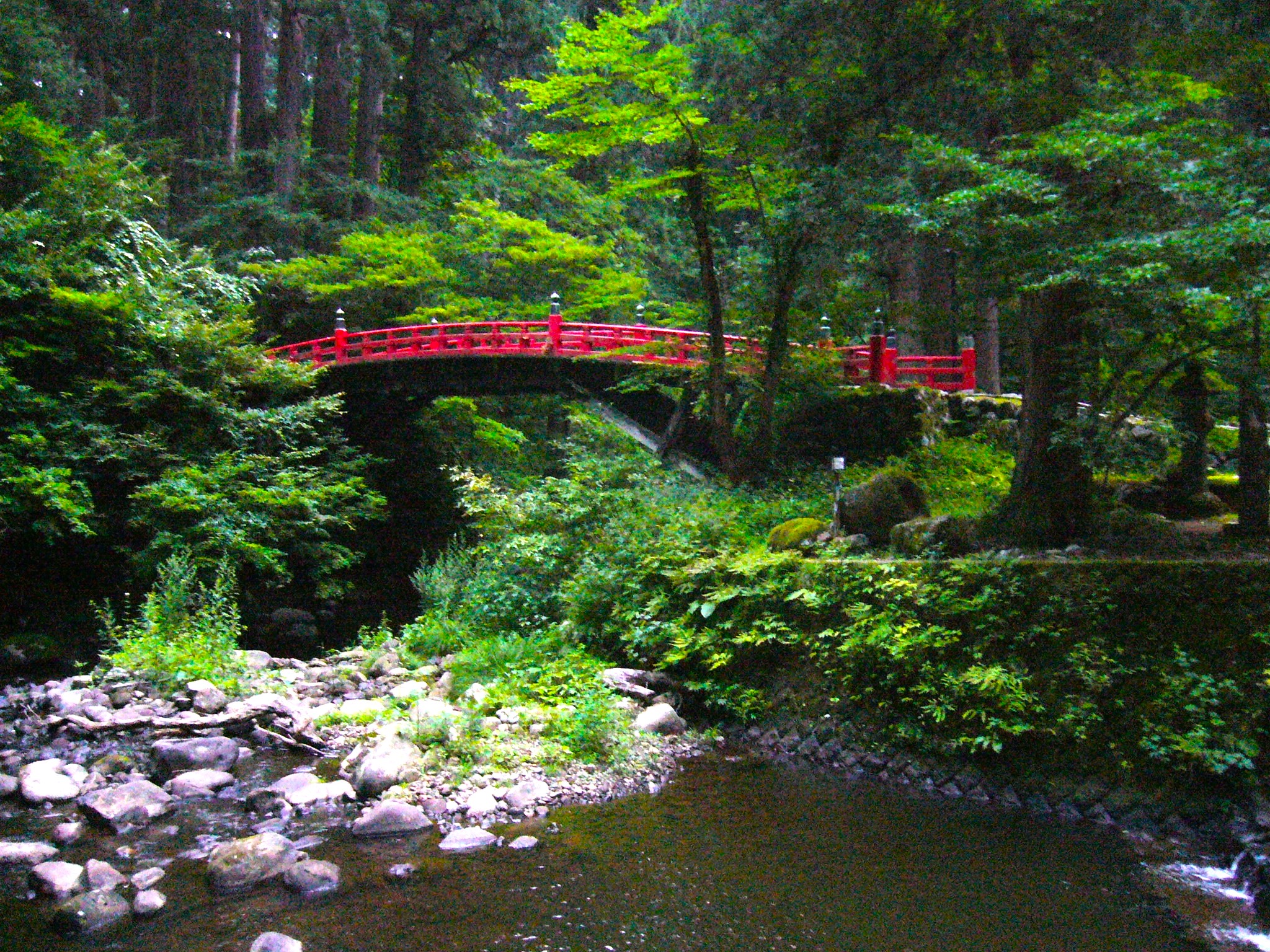 この参道がしばらくは、継子坂という急な石段の下りが続くことに驚かされます。下りきったところに祓川が流れ、六つの末社が立ち並ぶ場所からすぐのところにある祓川に架かる鮮やかな朱色の太鼓橋・神橋を渡る。緑の杉の木と朱色の神橋のコントラストが美しい。三山で行をする人、山伏たちは祓川で禊を済ませていきます。祓川は三途の川とも言われ、生と死の境界線を表し、この川で罪や穢れを洗い流したとされます。