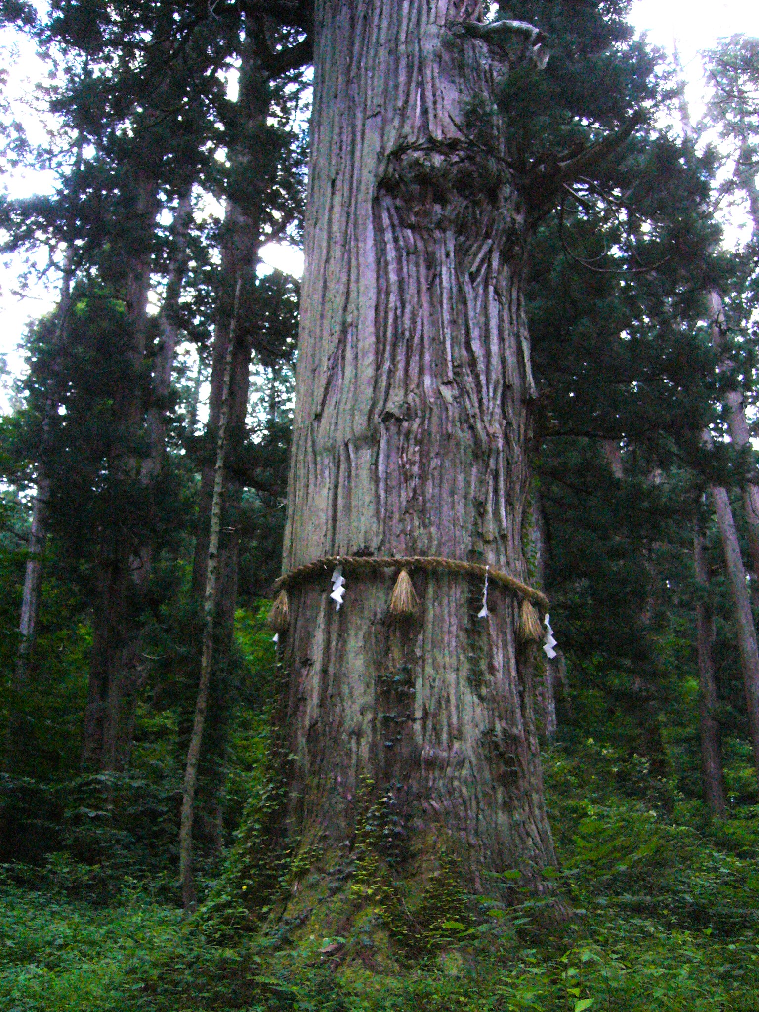 その爺杉の向こうには杉の巨木に囲まれ、まるで杉と高さを競うように建つ国宝・「羽黒山五重塔」の姿があります。風雨にさらされた古色蒼然とした色合いが、杉の木肌に似て木立に溶け込むような佇んでいます。承平年間(931~938)に平将門が創建したと伝えられ、約650年前の応安5年(1372)に再建された東北最古の塔です。高さ29.4mの三間五層柿葺で色彩を施さない素木造という伝統的な手法による均整のとれた優美な姿です。