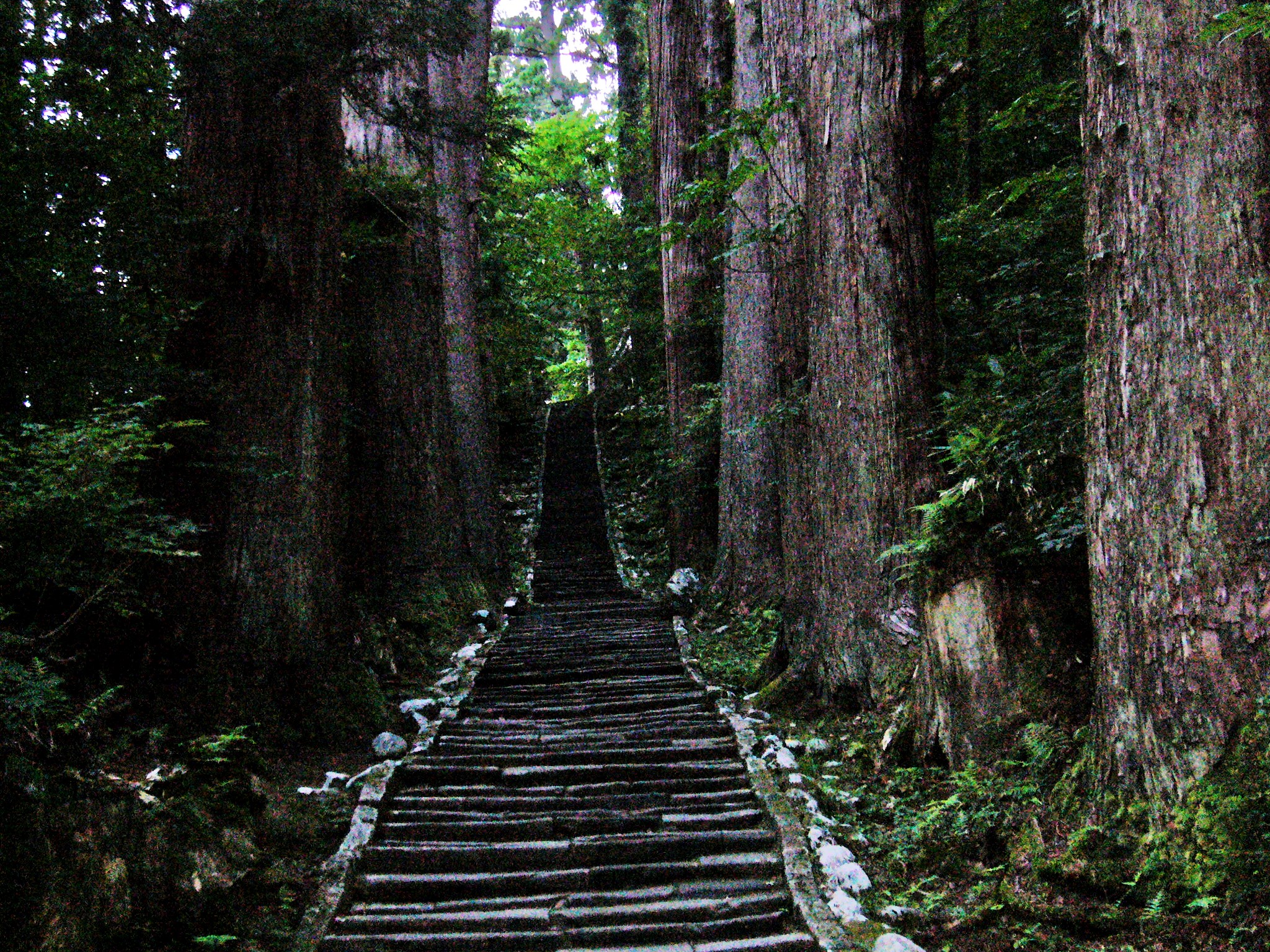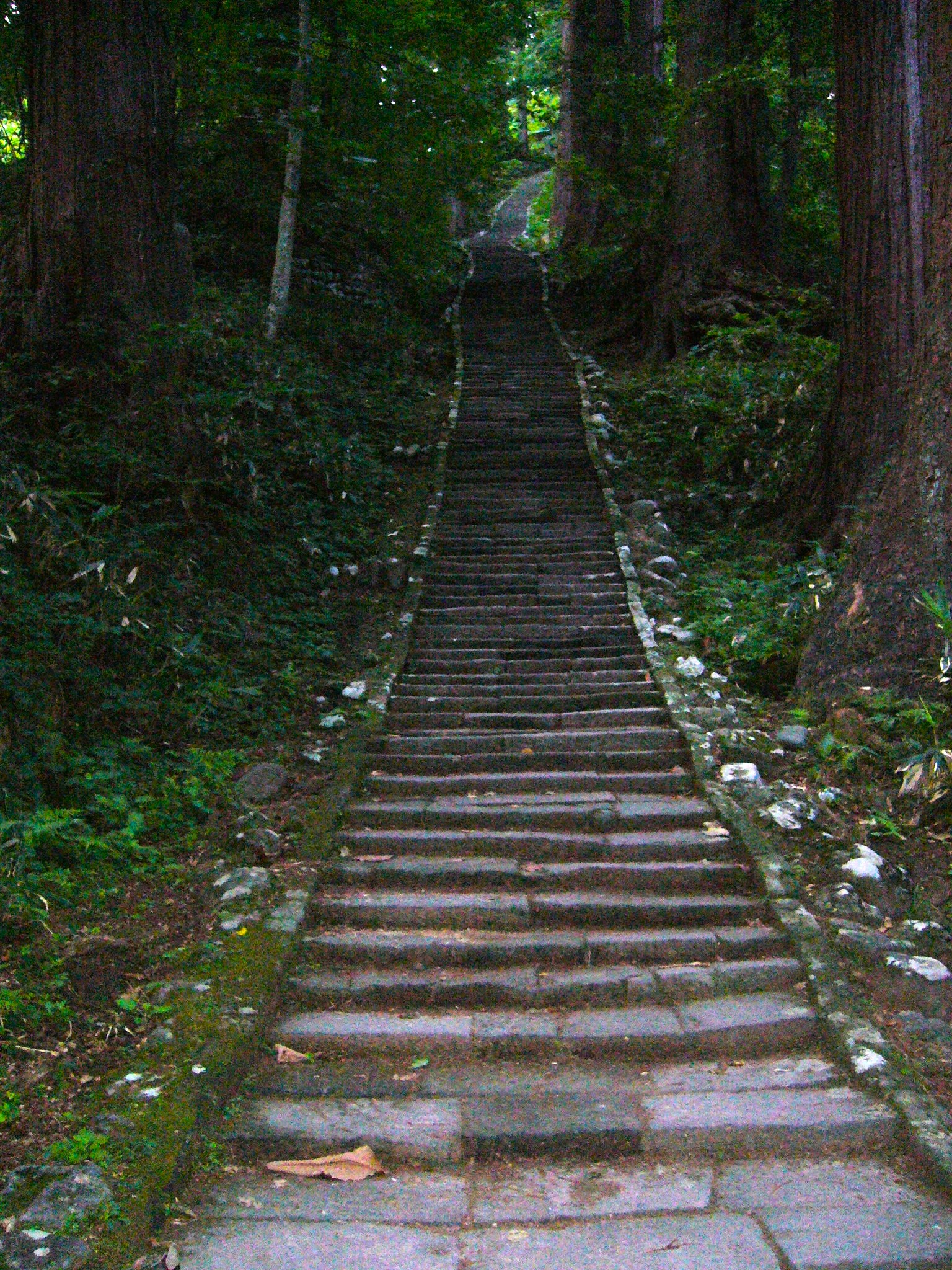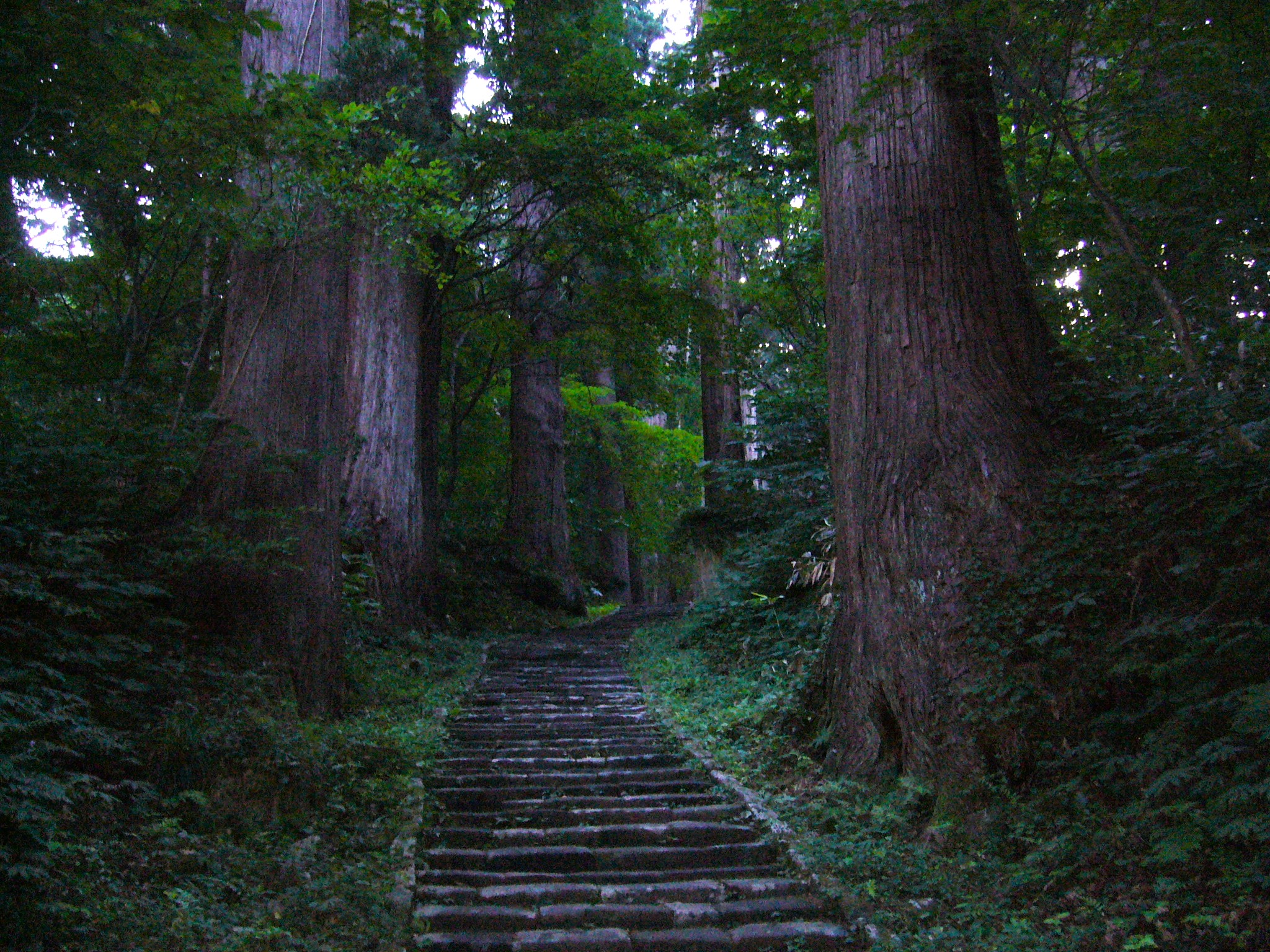 この杉並木の石段は、曲がりくねってのびているため、もうすぐ頂上と思いながらがんばって登ると、また石段が続いていく。。歩きながら現世の幸せを考えるためにこうした構造で造られ言われていて、朝陽が差し込む静寂な羽黒山の森で「現世の幸せ」を感じるには朝一番がベストです。