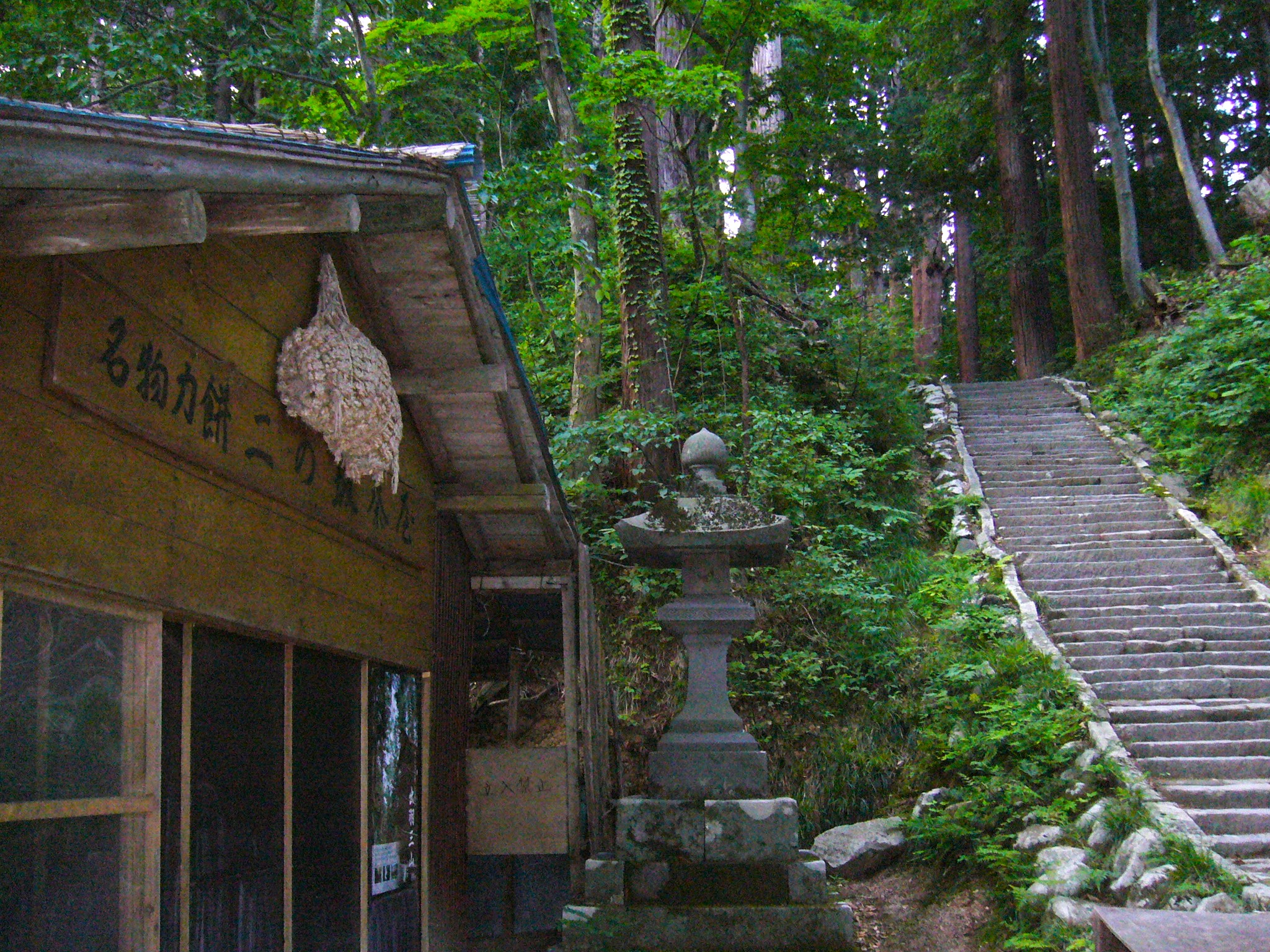 二の坂を上り切ったところにあるのが「二の坂茶屋」で、江戸期に石段ができた当時から、この場所で信者たちを迎えています。名物は餅にあんをまぶした力餅なのですが、あいにく今は朝の5時40分、この時間まだ開業していないのは当然か、残念です。しかしきつい石段を上り、汗を吹き、息を切らせた身には、何ともありがたい休憩の場所なのです。
