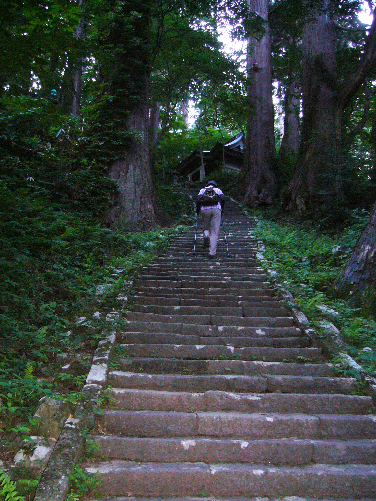 祓川から上りに転じた石段は、五重塔の前から一の坂、二の坂、三の坂と急勾配の石段が続きます。石段の左右に林立する樹齢三百年から五百年もの杉並木を仰ぎながら上る雰囲気は霊山を巡るスタートにもっともふさわしく、さすがミシュラン・グリーンガイド・ジャポン三ツ星です。二の坂で急に勾配を増します。別名「弁慶の油こぼし坂」といわれ、昔は油のような液体は、てんびん桶を担いで登ったわけですが、弁慶ですら勾配のきつさに体を傾け、油をこぼしてしまったと伝えれますます。比叡山西塔の「弁慶のにない堂」といい弁慶にはてんびん桶が似合うのでしょうか。
