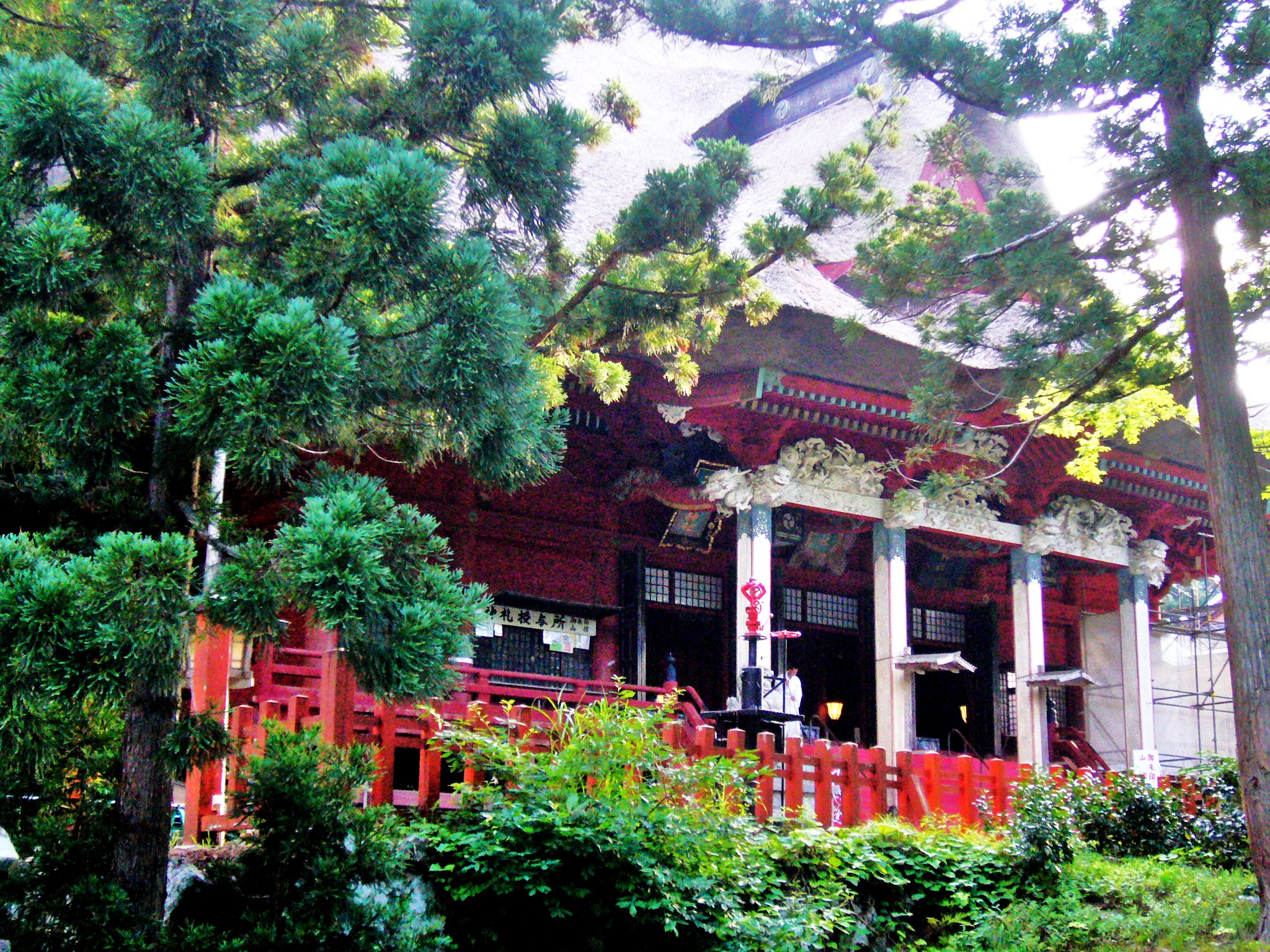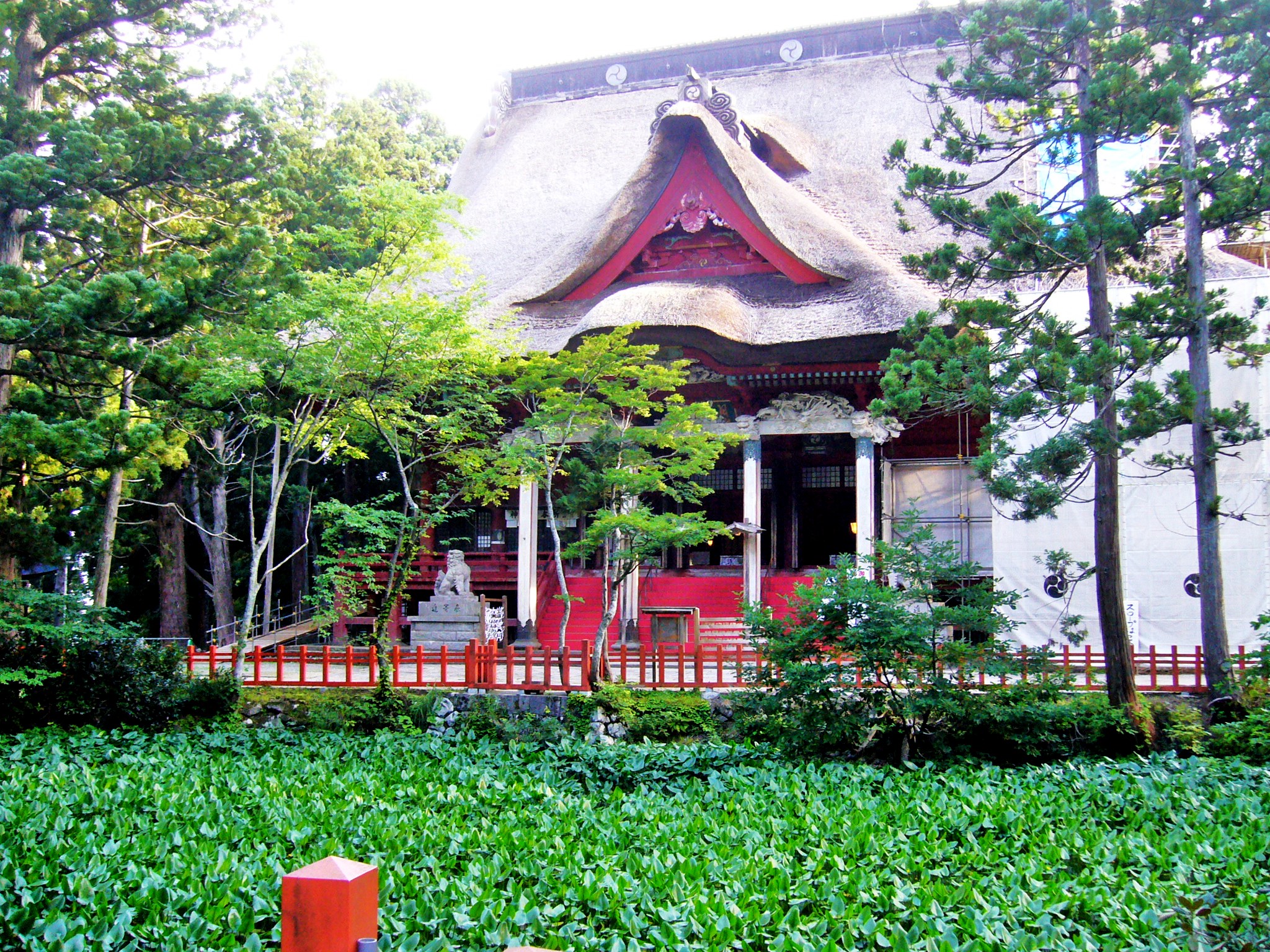 そして山上の中心、あくまでも高い木立の中の少し開けた荘厳な雰囲気を感じる場所に、羽黒山、月山、湯殿山の三神を合祭した三神合祭殿が堂々とした佇まいをみせています。月山、湯殿山は、半年以上も雪に閉ざされる山頂や渓谷にあり、通年の参拝や祭祀が困難なため羽黒山山頂に三山の神を合祀して造られたのが、三山の社号額が掛かる「三神合祭殿」です。旧羽黒山寂光寺の本堂で、文政元年(1818)の再建と伝わる。高さ28m、茅葺きの木造建築としては日本最大級で、杉材を主に使用しており、内部は総朱塗り、厚さ約2.1mの萱葺きの屋根が圧巻、重厚な雰囲気を醸し出しています。