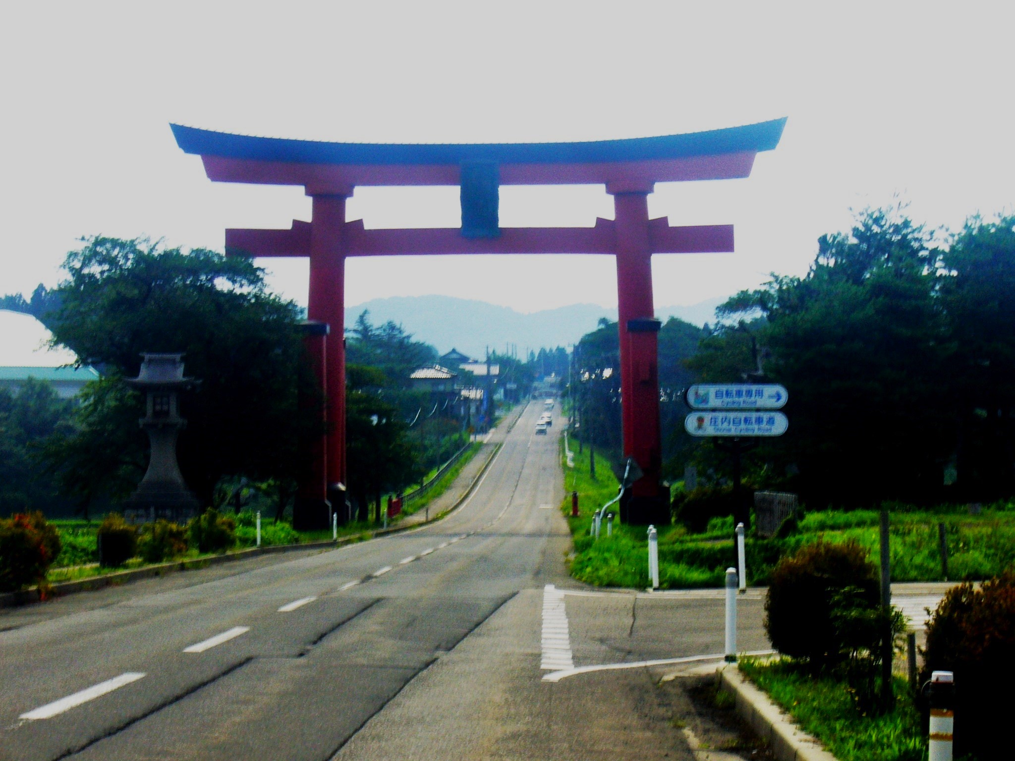 鶴岡市街から車で40分ほど、田園を貫くように500m程の直線道路の先に道を跨いで建つ赤く巨大な鳥居を見ることができます。羽黒山の入口にそびえる高さ20m、幅15mの東北最大の出羽三山神社の大鳥居です。北側から見ると背後に月山の優美な姿が拝め、水田の広がる庄内平野に凛と聳える赤い鳥居は美しい。鳥居から先が、羽黒山の神域であり、その鳥居をくぐると坂道にかかり、メインの道路を左折すると宿坊街・手向の集落。手向は「トウゲ」と読み、本来山道を歩いていて、道祖神に手向けをすることから転じているものと考えられています。以前は東田川郡羽黒町の字名であったところで、家の半分近くが宿坊みたいな町です。宿坊は寺社参詣の際、信者が宿泊して精進潔斎するための施設で、出羽三山にはその集落が数カ所ありますが、なかでも手向は羽黒山の入口に位置し、規模も大きいのです。松尾芭蕉が出羽三山を巡拝した際、世話したのがこの地に住み山伏の法衣を染める染物師である図司佐吉(俳号・呂丸)です。