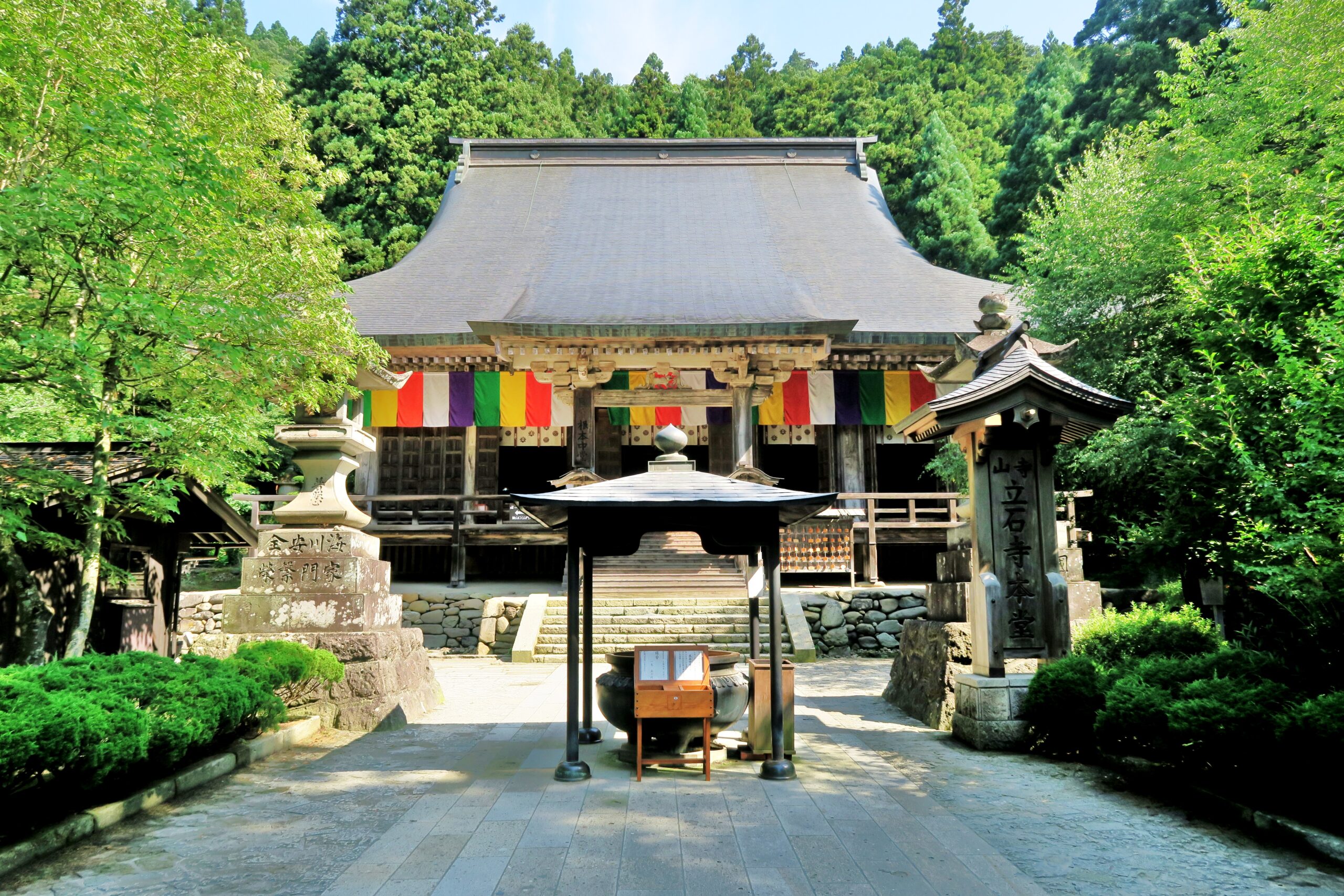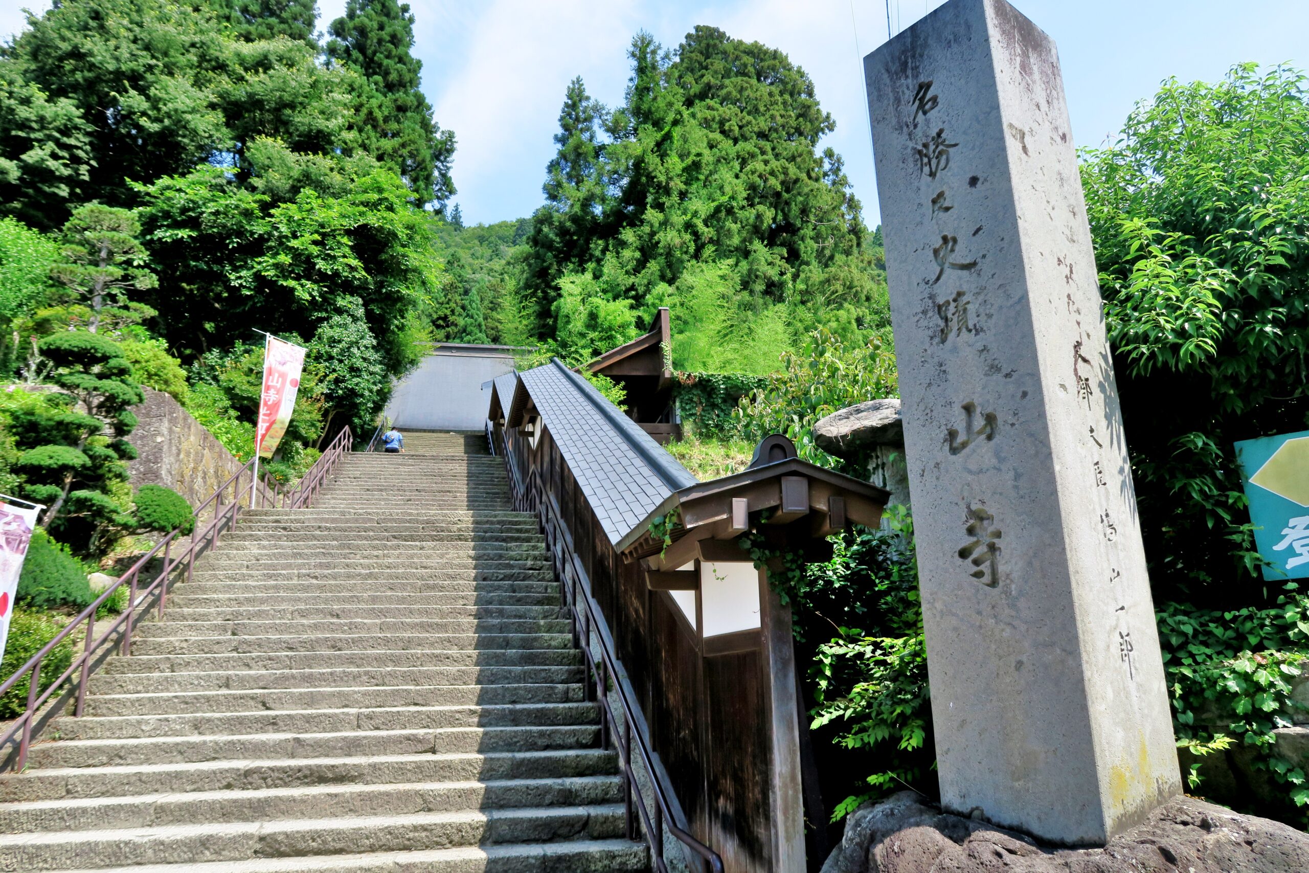 東北の霊場、通称「山寺」と言われますが、正式には「宝珠山立石寺」と言い、平安時代の初め貞観2年(860)第三世天台座主慈覚大師円仁によって比叡山延暦寺の別院として開山された天台宗のお寺です。急峻な山腹に沿って堂塔が建てられ、登山口から山頂の奥之院までは1015段の石段が続く静寂に包まれた参道が続きます。延暦寺に残る開山文書に円仁の名があり、砂金千両と麻布三千反でこの辺の土地を買ったという記述があります。当時と比べれば規模が小さくなったとはいえ、現在も33万坪のもの境内地を持ち、その中に大小30余りの堂塔が残されています。