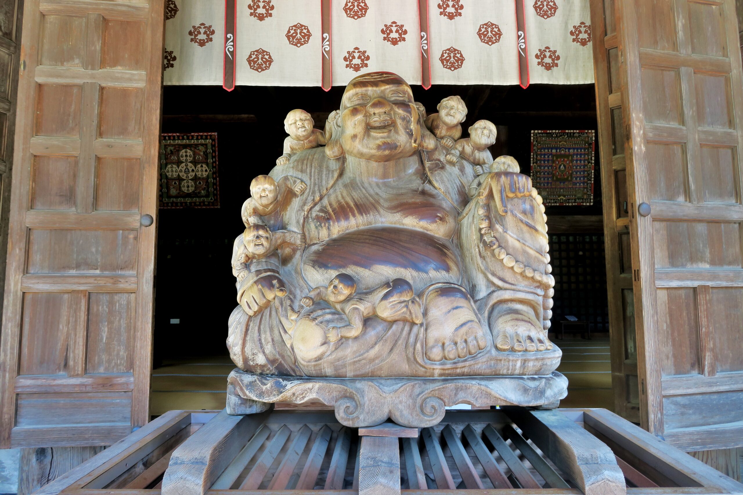 根本中堂の前に祀られた布袋様の像、お腹を撫でてお参りをするといいことがあるとか。