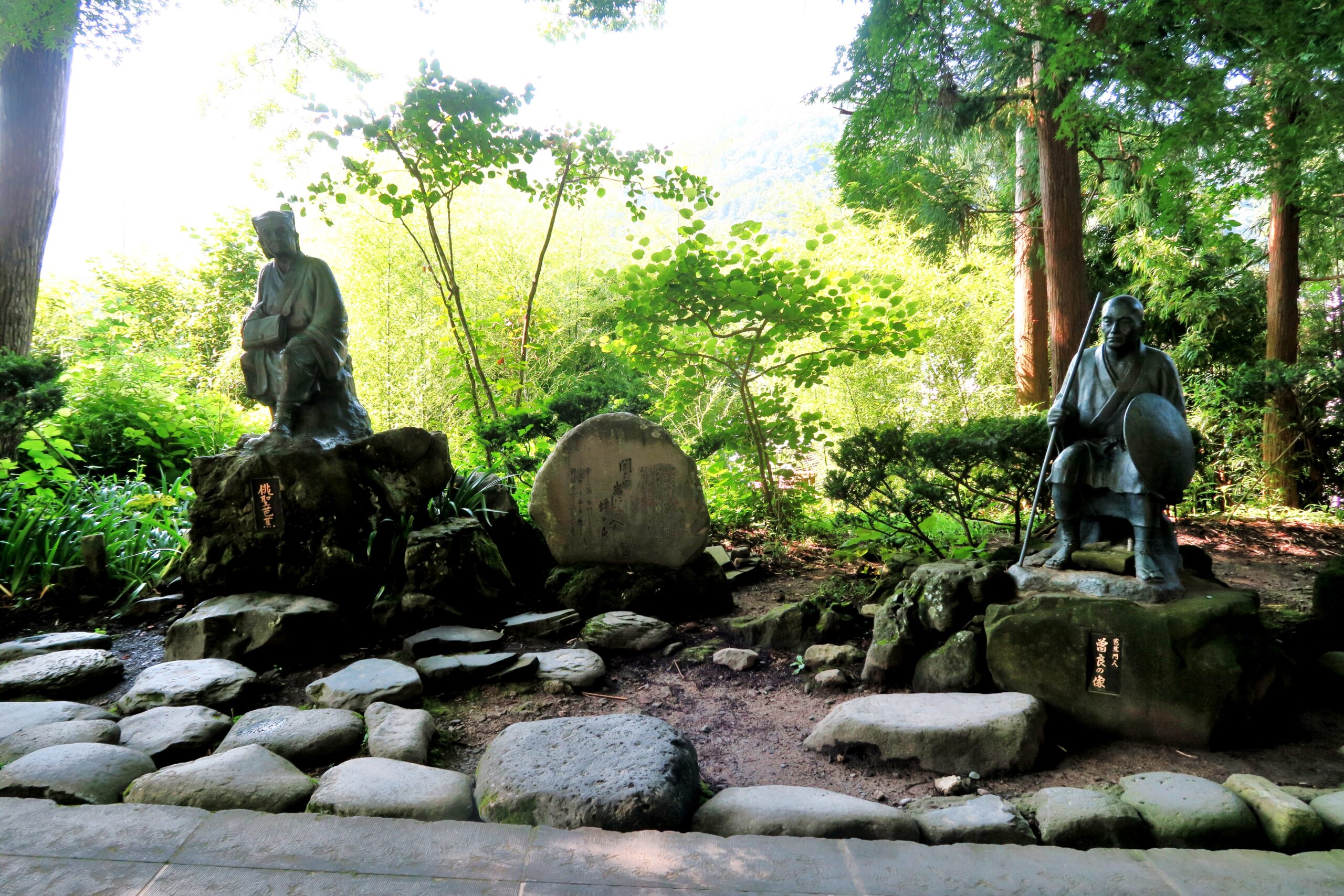 宝物殿前には「芭蕉・曽良像」があります。元禄2年(1689)芭蕉の「奥の細道」の紀行文に、山形領に立石寺といふ山寺あり。慈覚大師の開基にして、殊に清閑の地なり。一見すべきよし、人々の勧めるによりて、尾花沢よりとって返し、その間七里ばかりなり。日いまだ暮れず。とあるように古い友人・鈴木清風のいる尾花沢から日本海を目指して西へ向かうつもりでしたが、土地の人々に一見を勧められて南へ8里余の立石寺まで足を延ばしたのです。