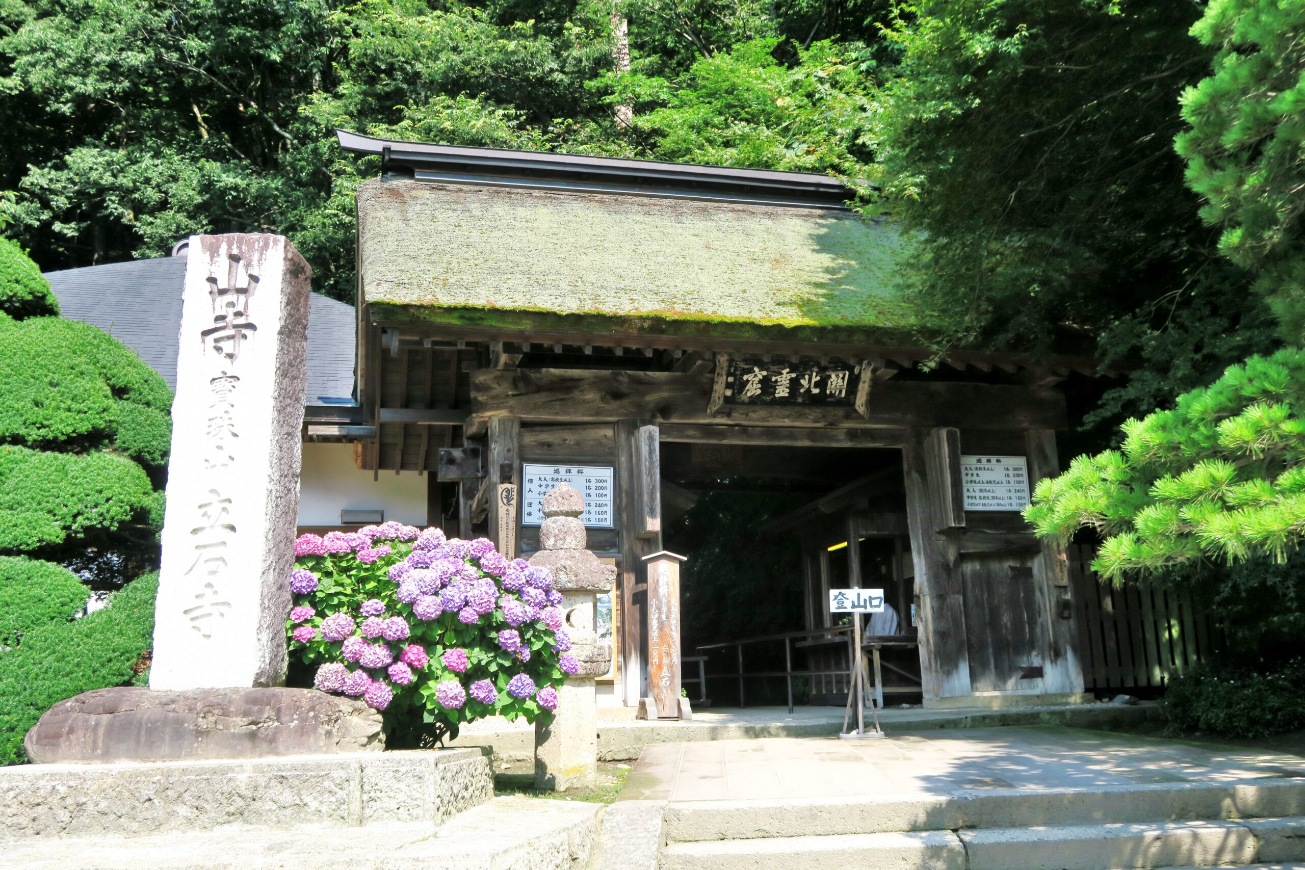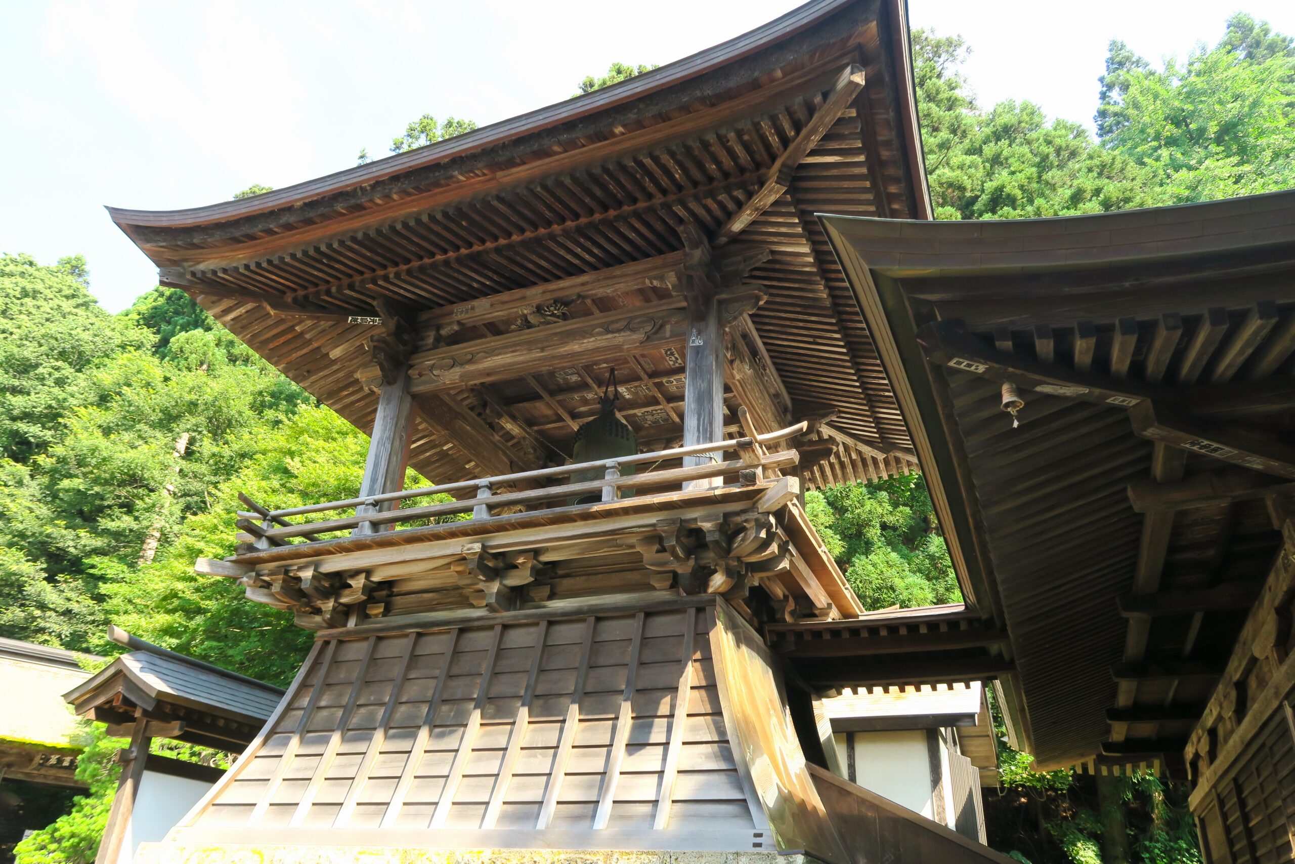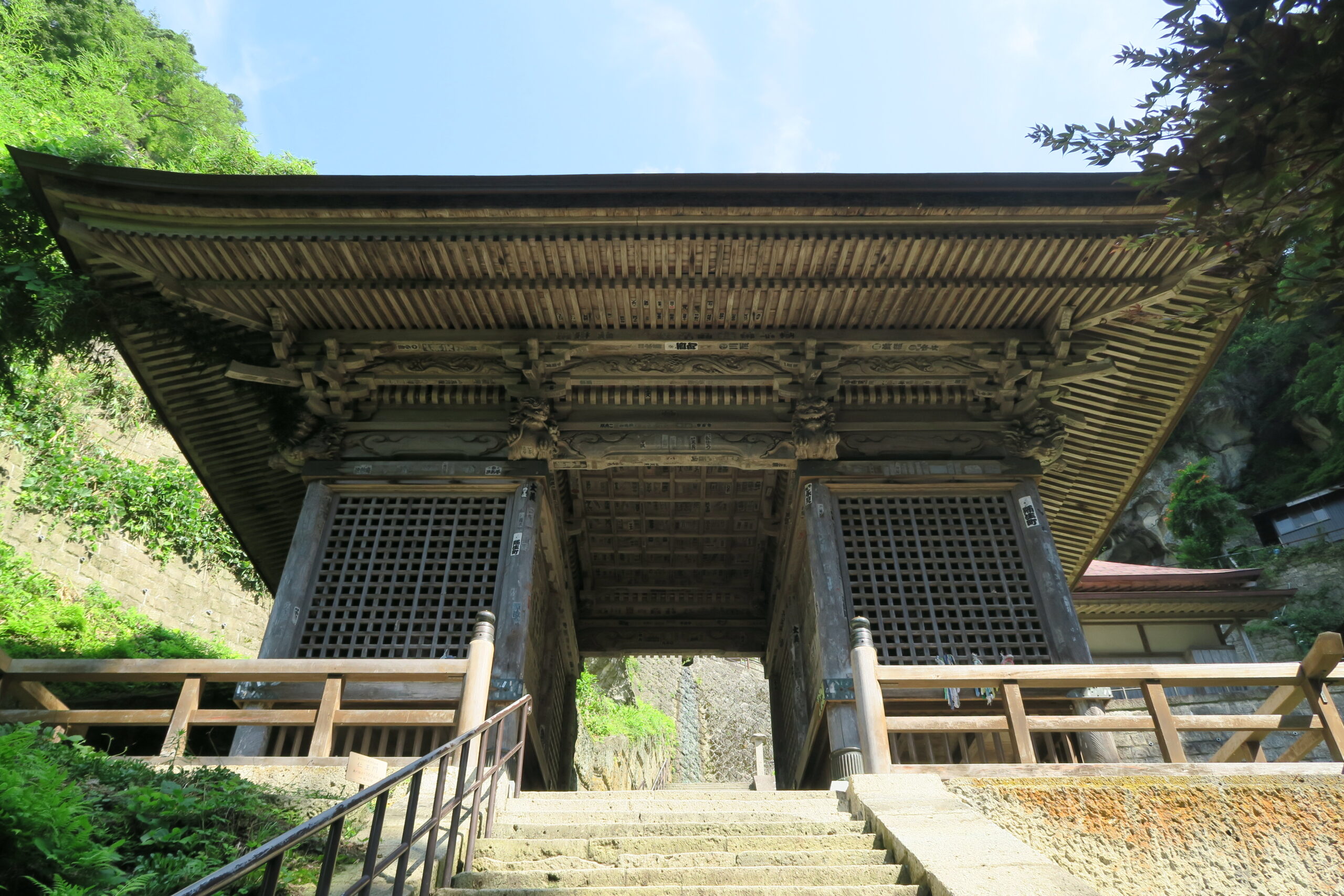 いよいよ「山門」からの石段コースが始まります。鎌倉時代建造の歴史を感じさせる茅葺き屋根が風情のある山門は、開山堂などへの登山口で、大仏殿のある奥之院までの石段は800段を越えます。その途中、数十メートルの岩の上に建つ堂塔や数百年の樹林の間に貴重な宗教文化と自然景観が一体となった日本を代表する霊場の入口です。ここで入山料300円を修めます。