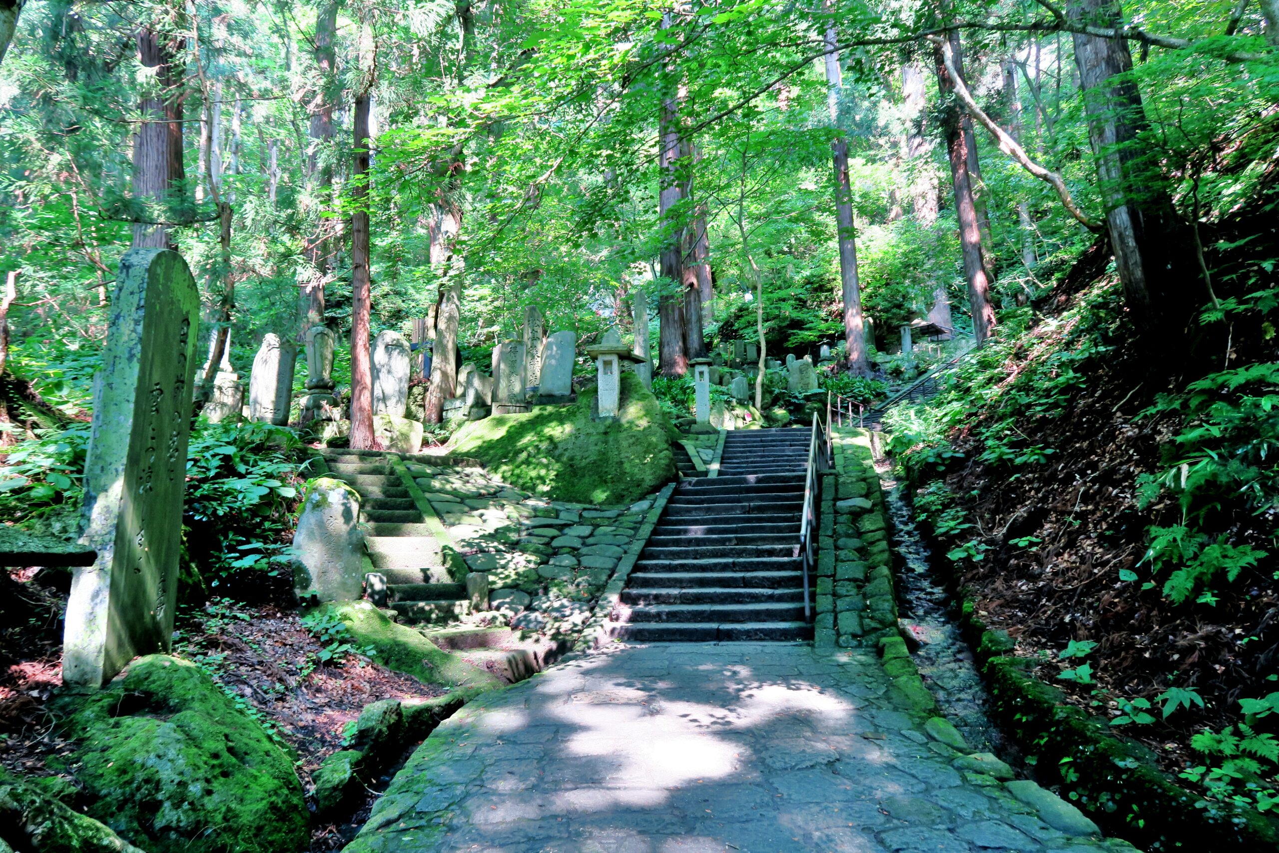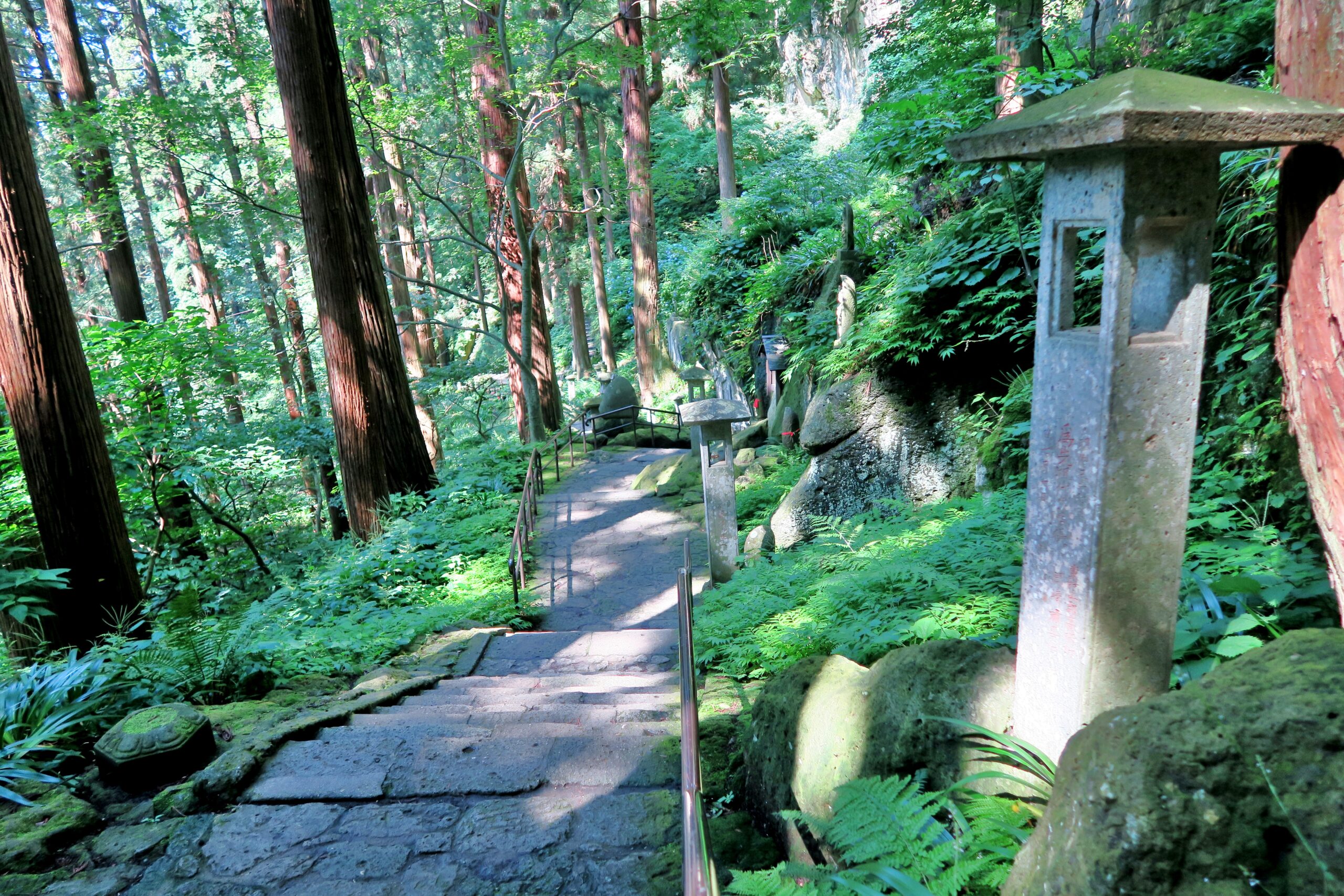 お山の自然に沿ってつくられたこの参道は、昔からの修行者の道です。一番せまいとことは約14cmの四寸道で、開山・慈覚大師の足跡をふんで私たちの先祖も子孫も登ることから親子道とも子孫道ともいわれます。