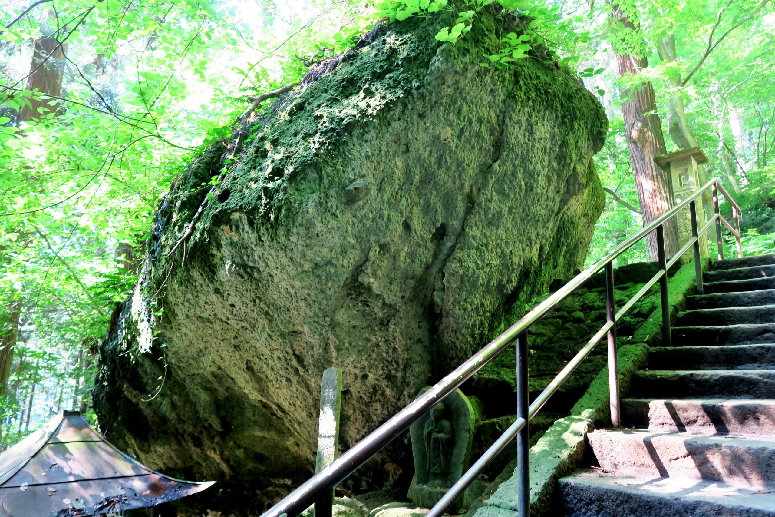 姥堂の向かい側にある大きな岩は笠岩といい慈覚大師が雨宿りをしたところとも伝わります。