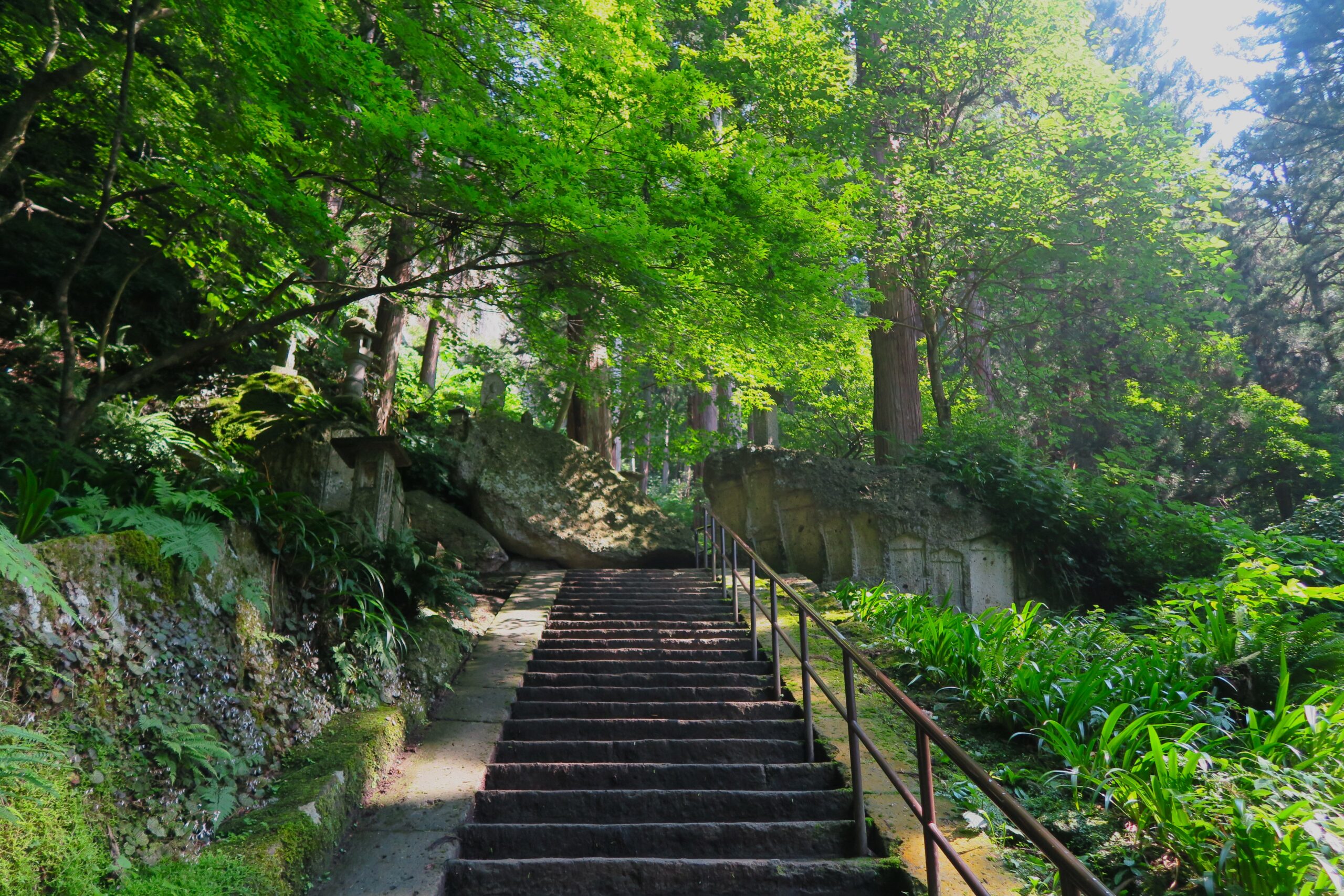 俳人・松尾芭蕉が「閑かさや 岩にしみ入る 蝉の声」の名句を残した東北の霊場山寺・立石寺。せみ塚、弥陀洞を訪ねると、芭蕉が残した風景に出会え、澄み渡る群青の空に浮かぶ五大堂を眺めると、その雄大さに時が経つのを忘れてしまいます。さあ!山寺に出発します。一般に「山寺」と言うと、石段がたくさんある険しい所といったイメージですが、現在は石段も整備され大変登りやすくなっています。数多くのお堂に手を合わせ、周囲の景色を楽しみながら山道を登り、ゆっくりとした時間がたのしめます。