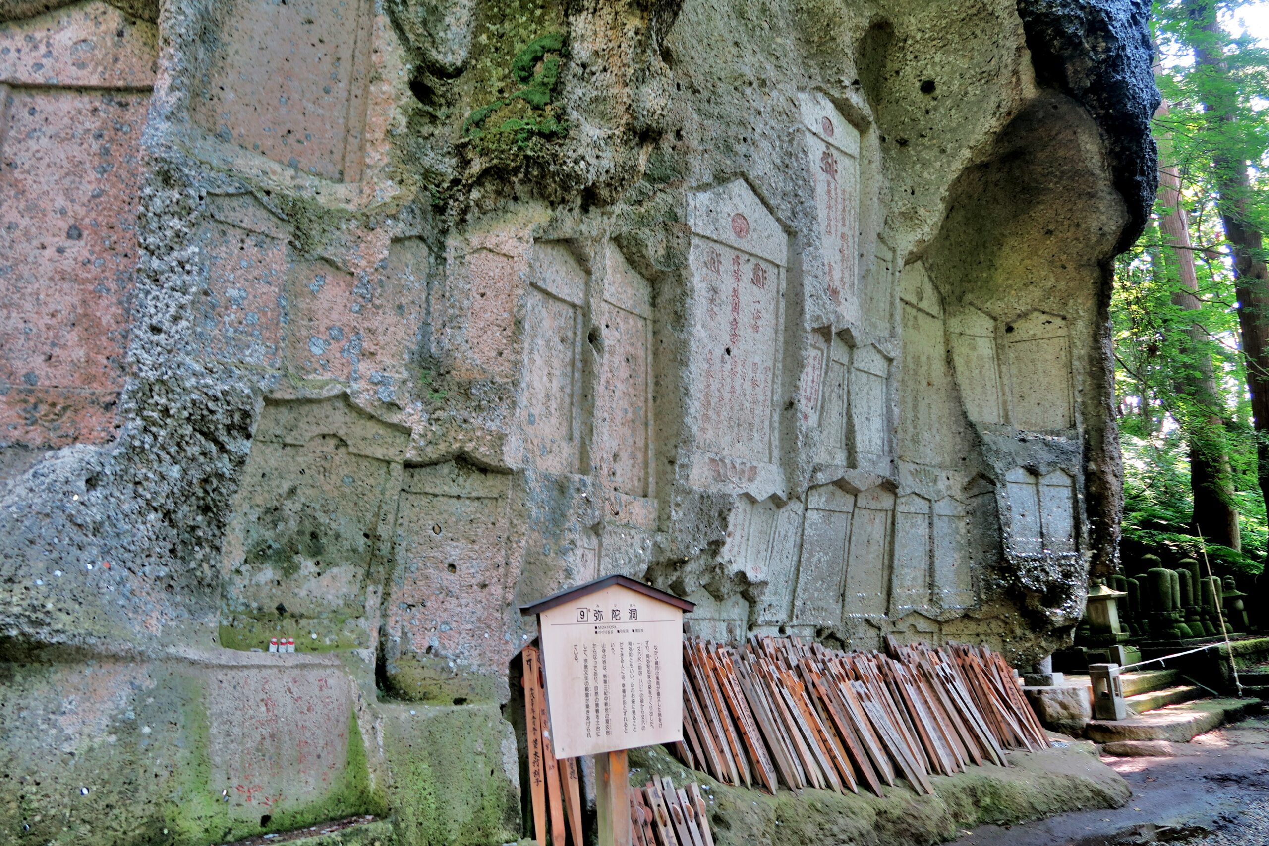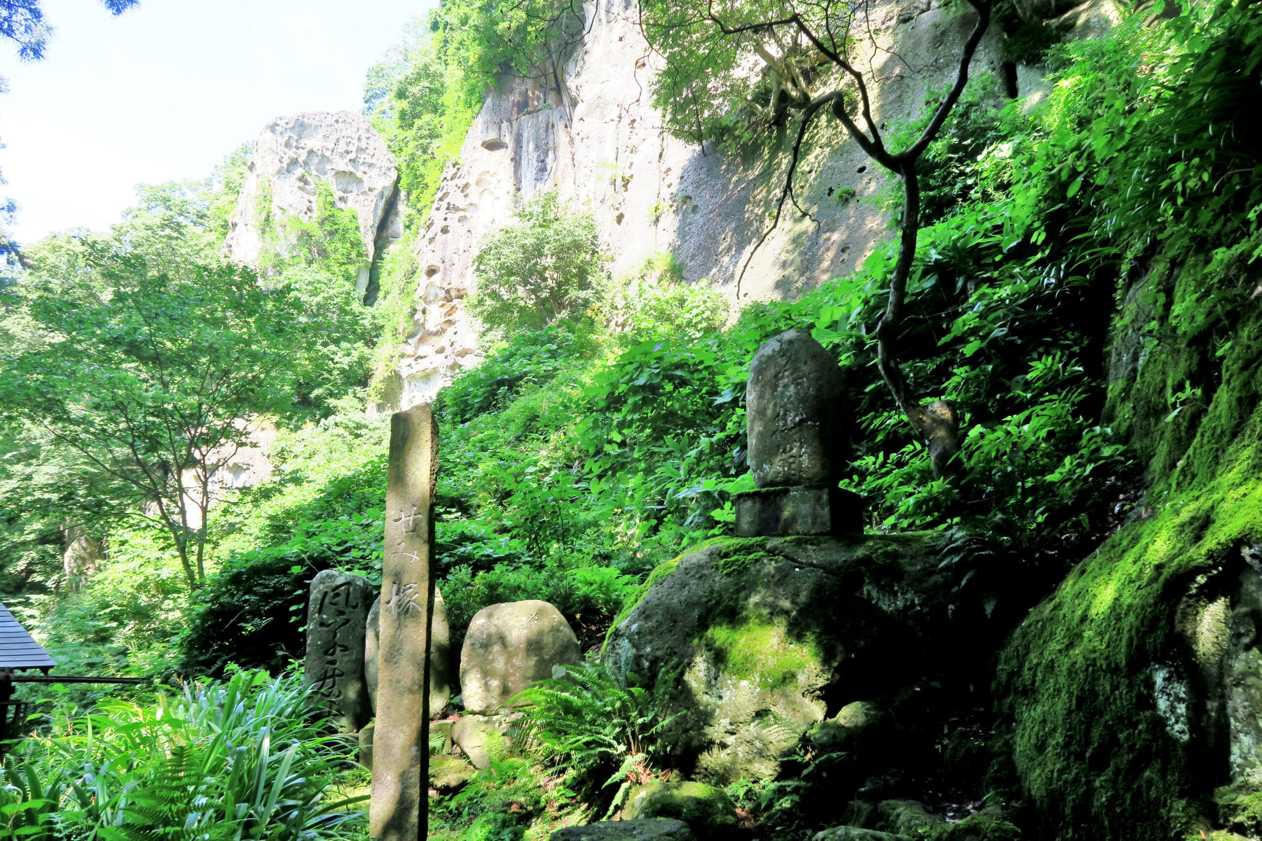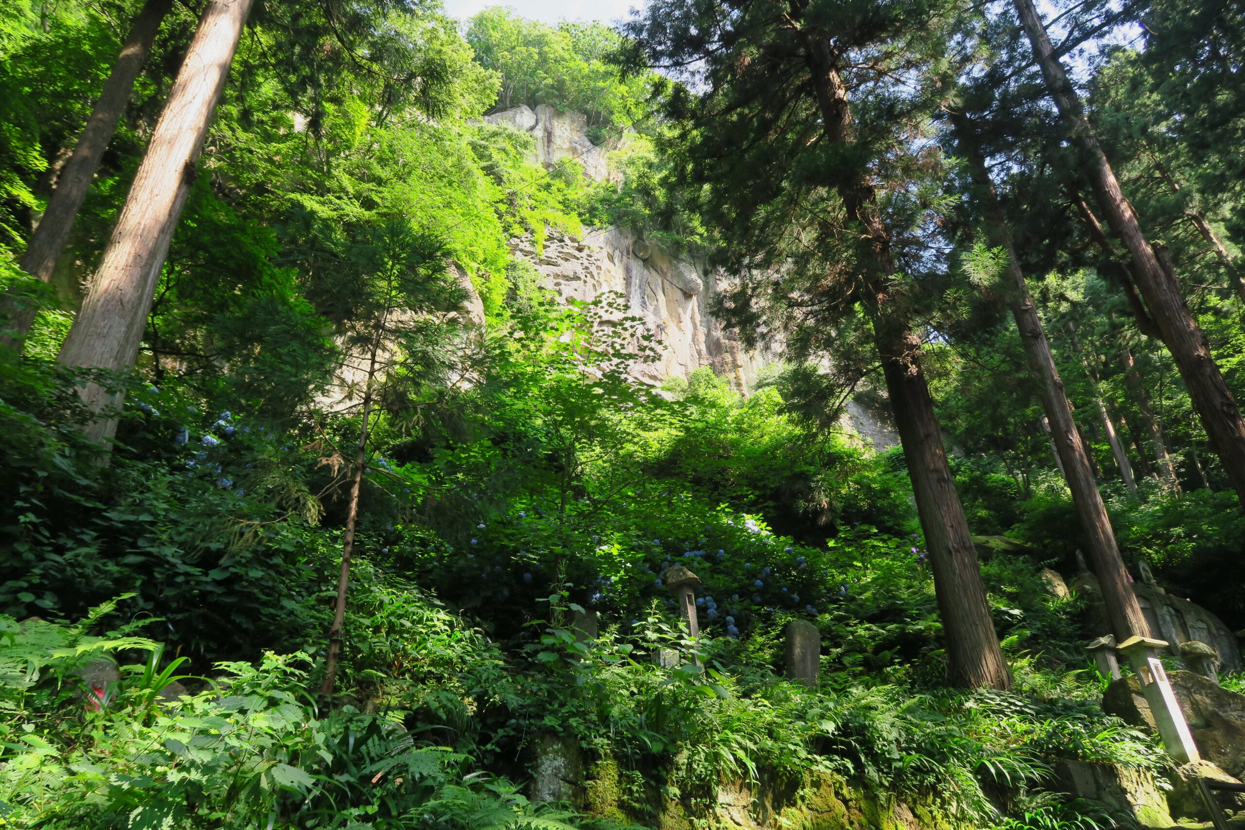 蝉塚の東にある「弥勒洞」は長い歳月の雨風が直立した凝灰岩を風化させ、阿弥陀如来像を彷彿とさせることからの名称です。1丈6尺(約4.8m)の姿から丈六の阿弥陀ともいい、仏のお姿に見ることができた人には幸福が訪れるといいます。山寺の岩は、新第三紀中新世の凝灰岩からなっており、自然景観を土台にして、宗教文化の殿堂が築きあげられています。岩肌には「岩塔婆」という板碑型の供養碑が直接刻まれています。納骨を伴わない詣り墓に一種です。ここから奥之院まで580余段です。