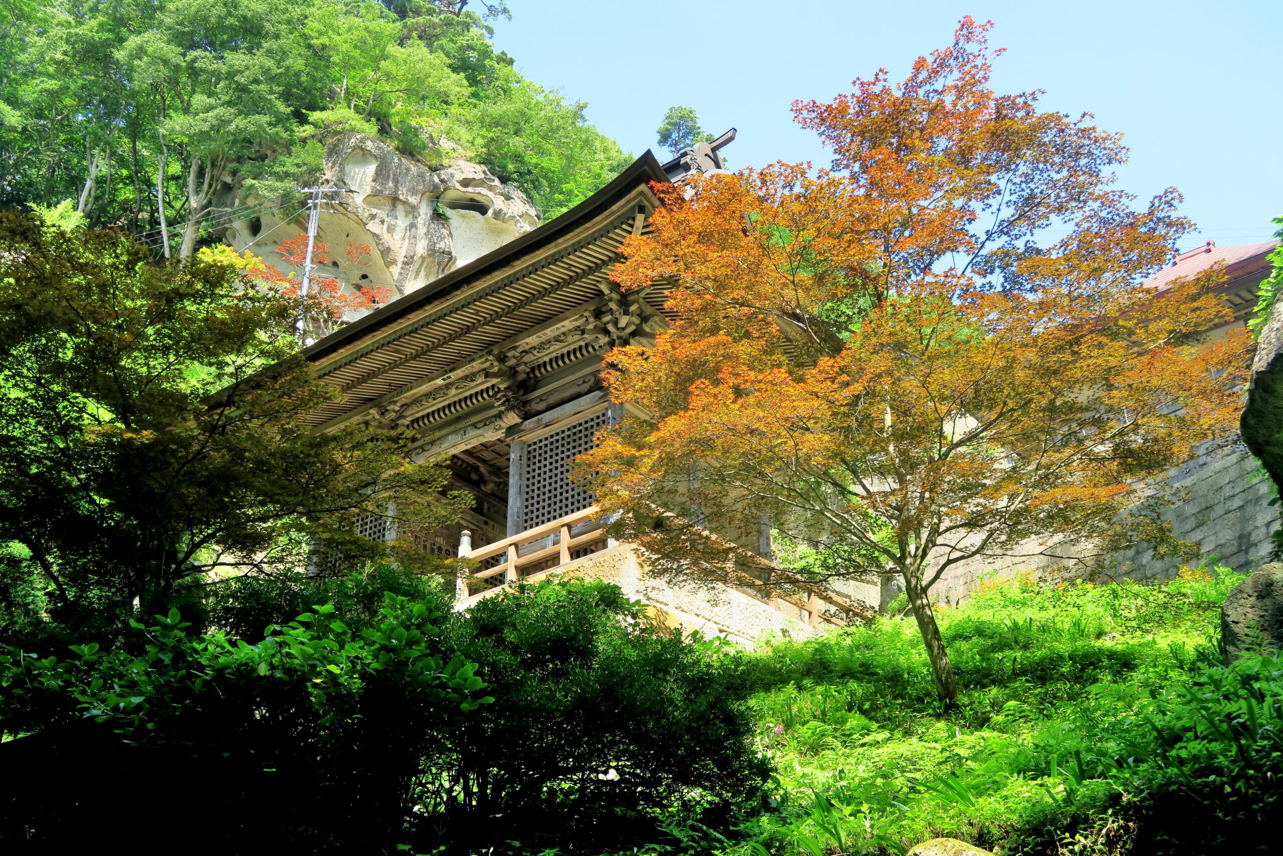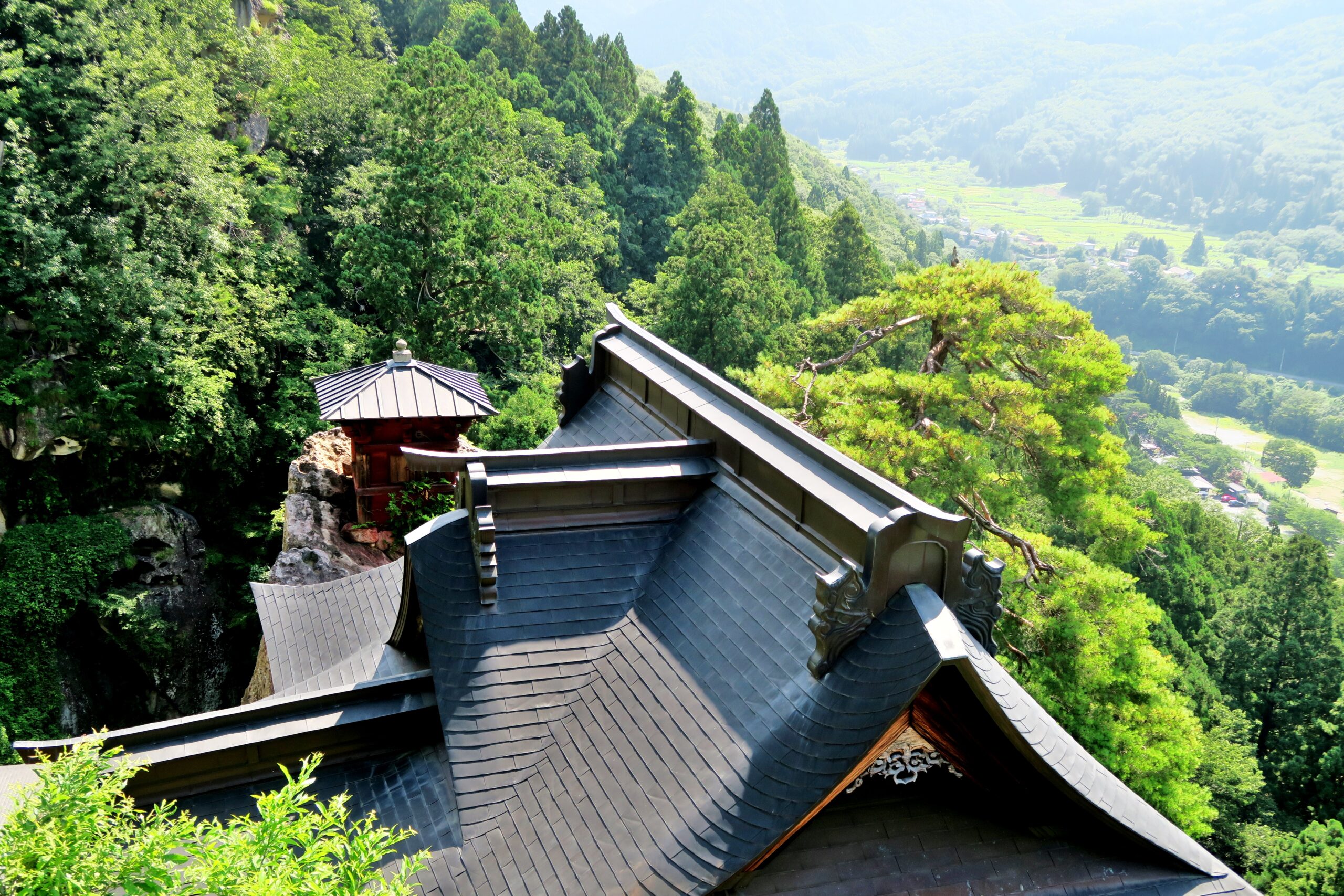 五大堂から開山堂、納経堂を見下ろせば、杉木立の中、奇岩が折り重なるようにして続き、霊場ならではの厳粛さと静寂が満ちています。この3つは山寺を代表する建造物です。