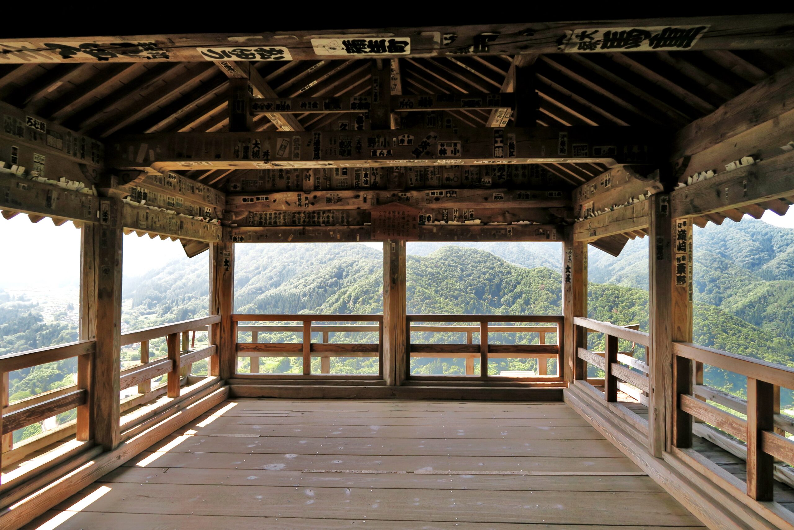 さらに開山堂の右手にある石段を上ると頭上の建物は五大堂といい、正徳4年(1714)に再建された舞台造りのお堂です。宝珠山を守る五大明王を祀って天下太平を祈る道場として、山寺開山30年後に慈覚大師の弟子・安然が建立しました。眼下に山里に囲まれたのどかな町並みを見下ろせる山寺随一の展望台です。