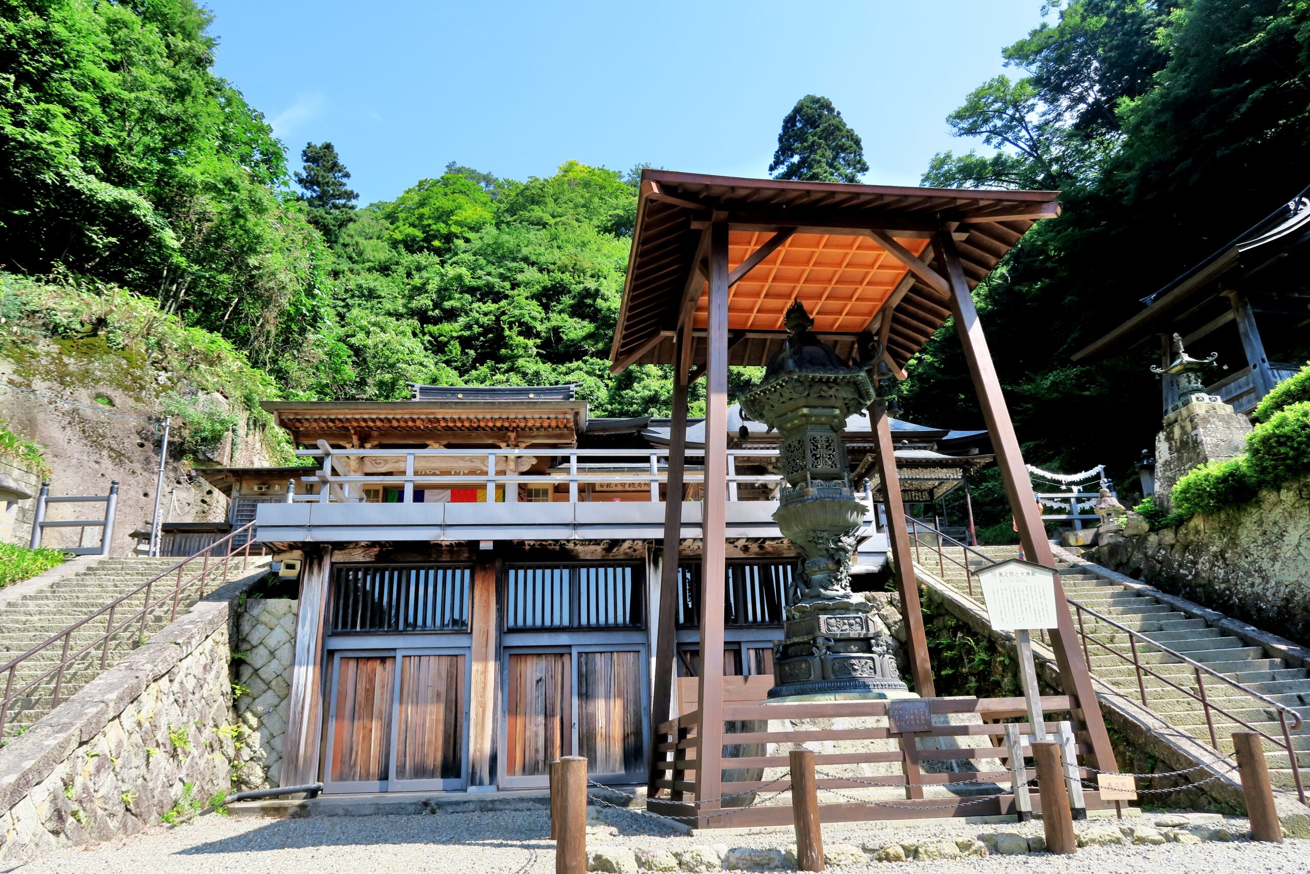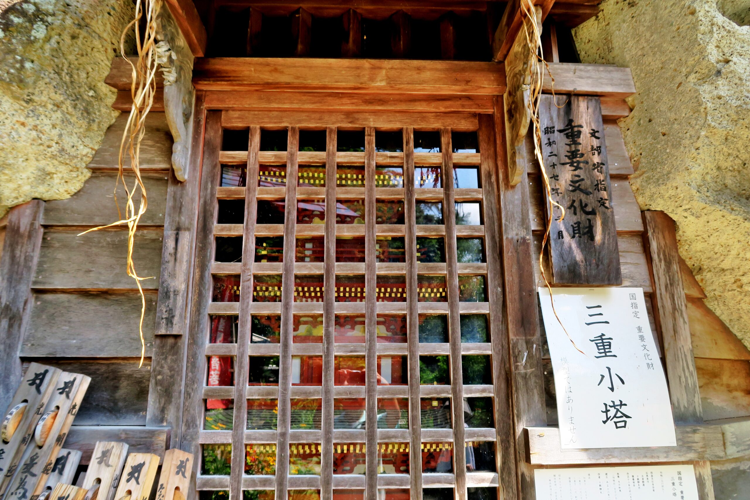 江戸時代までは、12の塔中支院があり多くの僧が修行に励んでいましたが、今では、仁王門から奥之院の間に性相院、金乗院、中性院、華厳院の4つの山内支院がその面影を残しています。奥之院から脇道に入った奥が華厳院です。慈覚大師円仁が開山のころ住んでいたと伝わり、手前右側の岩屋には全国で最も小さい三重小塔も祀られています。戦国時代に造られたもので、高さ2.4mです。