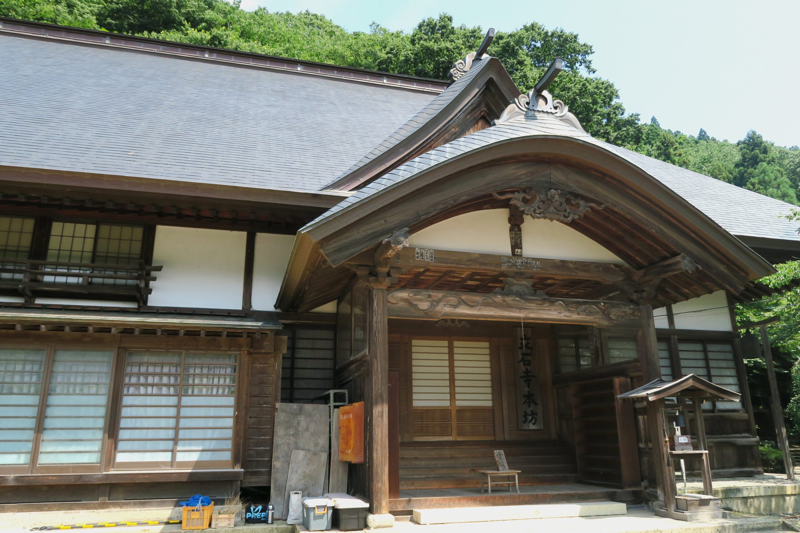 抜苦門を潜ると立石寺本坊に出ます。周囲には神楽岩や蛙岩などのい巨岩や羅漢像が安置され山内の維持管理や宗教的な祭事や行事ばどを行う立石寺の中心をなす建物です。建物は木造2階建て、寄棟、銅板葺、平入、外壁は真壁造、白漆喰仕上げ、玄関屋根は唐破風、その上部の大屋根を千鳥破風として正面性を強調しています。
