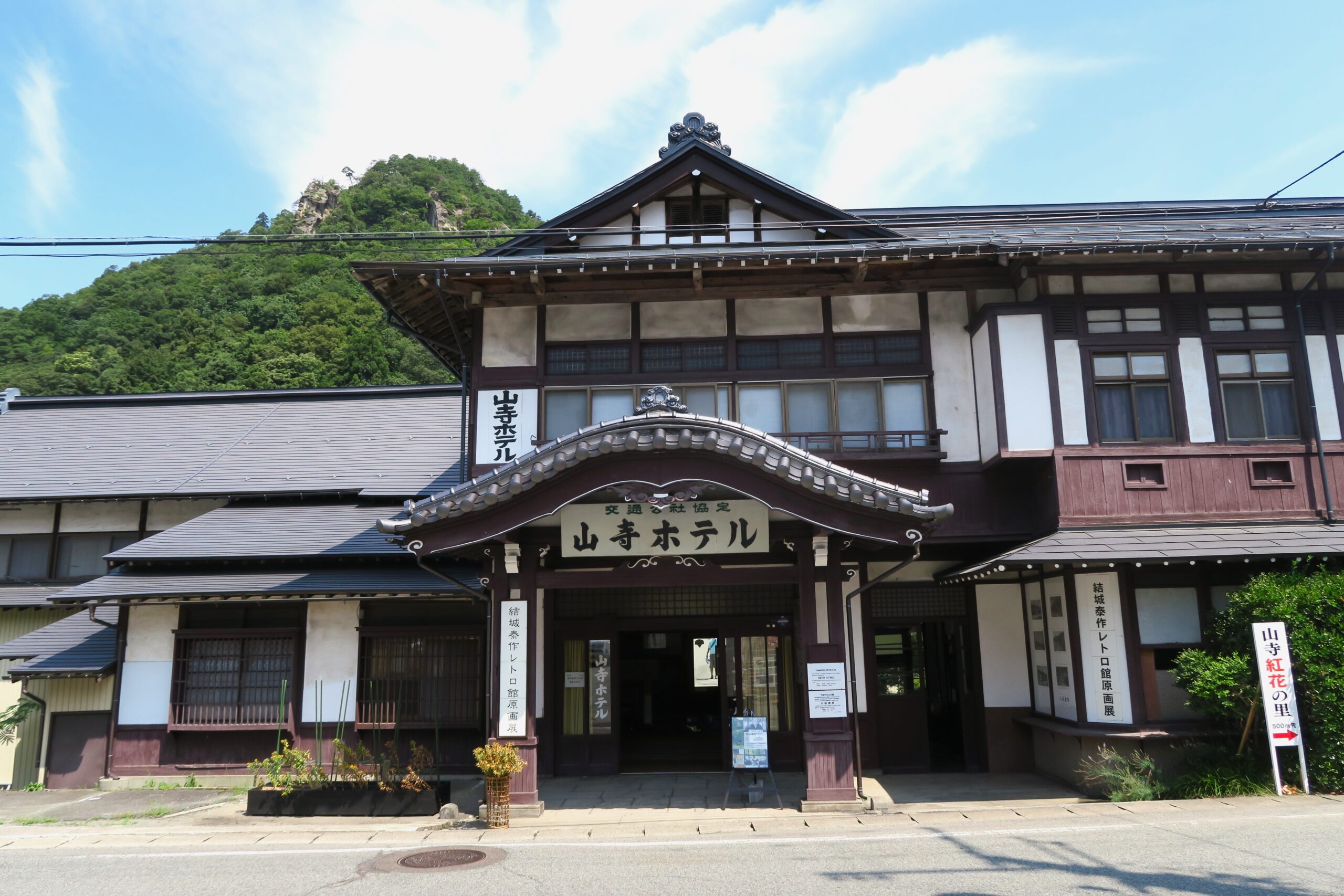 ちなみに駅前正面突き当りにある建物は、大正5年竣工の本館を背面に、昭和11年(1936)に増築された老舗ホテル「旧山寺ホテル」です。平成19年に閉館され現在はレトロ館原画展示館として使われています。