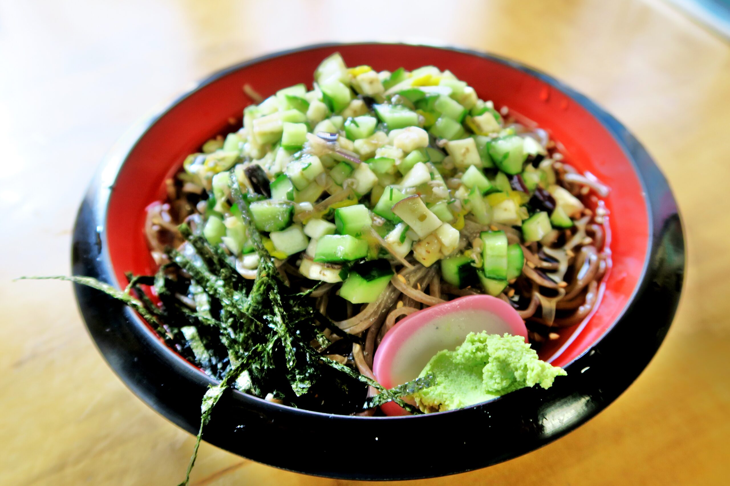 店内の窓際のカウンター席から緑濃い山々と澄み切った立谷川の流れを眺め、旅情豊かに味わうそばは、山形県産のそば粉「でわかおり」を使用した香りがよくコシの強い手打ちの二・八そばに刻んだキュウリやナス、ミョウガ、ショウガなどの地元産の夏の香味野菜と薬味に納豆昆布を加えた山形の郷土料理「だし」をたっぷりのせた冷たい名物おそばです。やや大きめに刻まれただしの具は10種類で彩りも豊かな山形の旨いものをギュッと詰めた自慢のひと皿です。