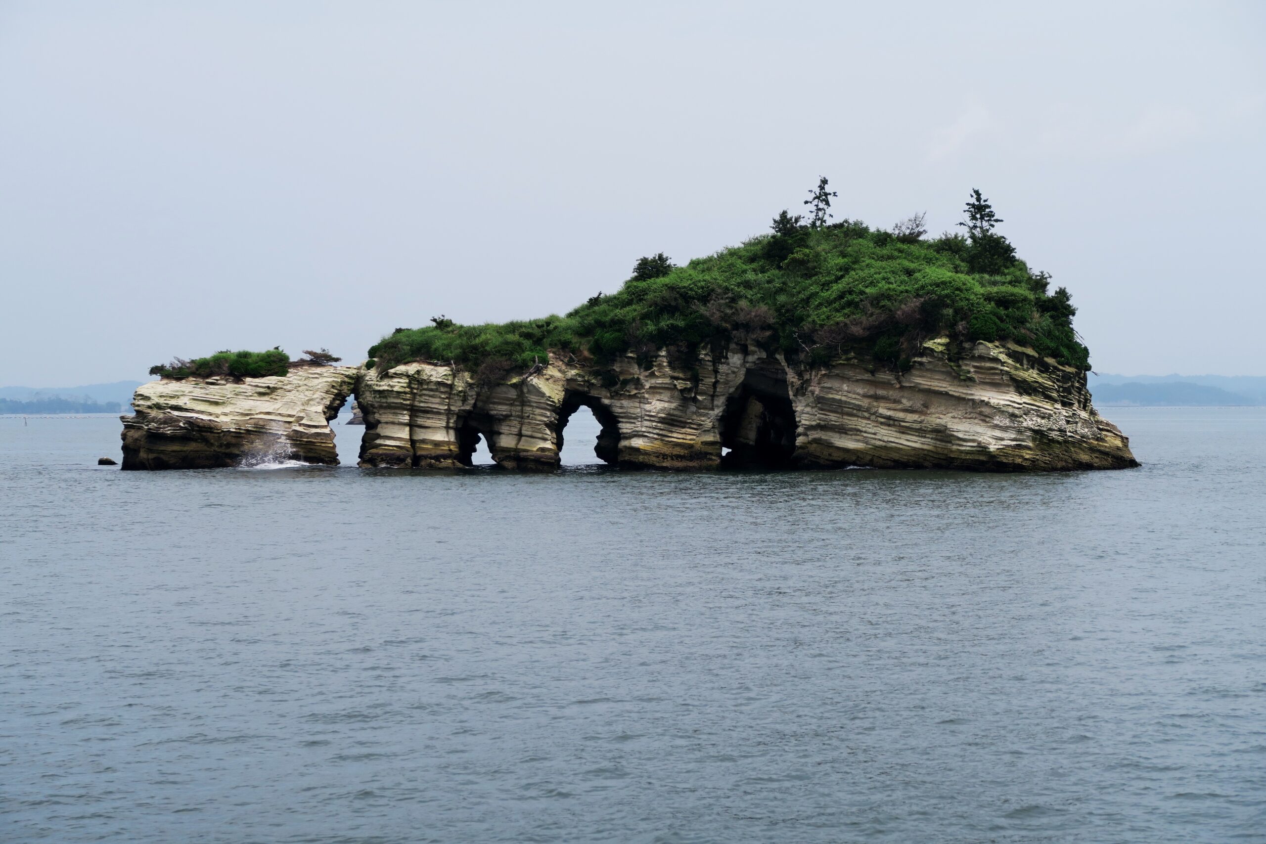 海食によって開いた4つの穴が特徴の「鐘島」。穴に波が打ち寄せるとゴーンと鐘のような音が鳴り響く島です。穴が小判のように見え、別名「金の島」ともいいます。松島の景観はボコボコっと島が海に浮かび、切り立った白い岩肌が美しく、そこに松などの緑が映え、白と緑のコントラストが見事です。凝灰岩は風化しやすく、柔らかさが特徴で、松島湾の島は凝灰岩でできていることから風化により表面が崩れ、中の白い部分が露出したことによります。また松は栄養分の乏しい場所に強く、塩害を受けにくいことも松島らしさを形成しています。