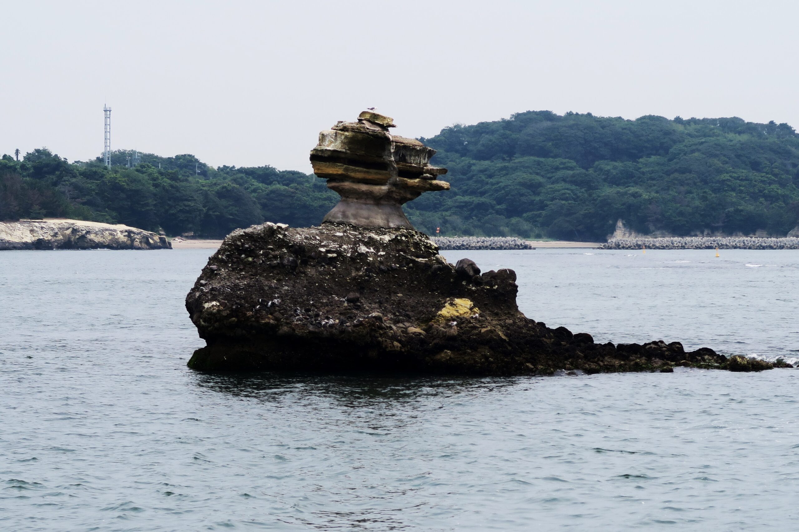 松島湾クルージングの名物スポットになっているのが「仁王島」です。浸食された集塊岩の上に乗った大きな泥岩が怪奇な形相の顔のように見える伊達正宗公お気に入りの島です。仁王像が葉巻をくわえて座るように見える力強い姿が印象的です。