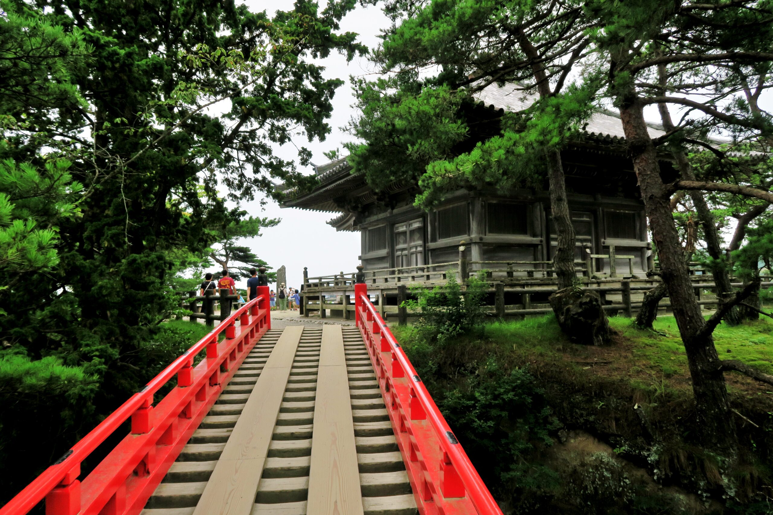 足元の床から下の海が見える朱塗りの「透かし橋」で五大堂に渡ります。橋板の間が空いていて高さもあるので、踏み外せば海に落ちそうで怖いのですが、これは参拝の際に、その人の身も心も引き締まるようにと、あえてこのような造りになっているどうです。五大堂はそれだけ清浄な場所だということです。現在は縦板が渡されているもののスリリングです。
