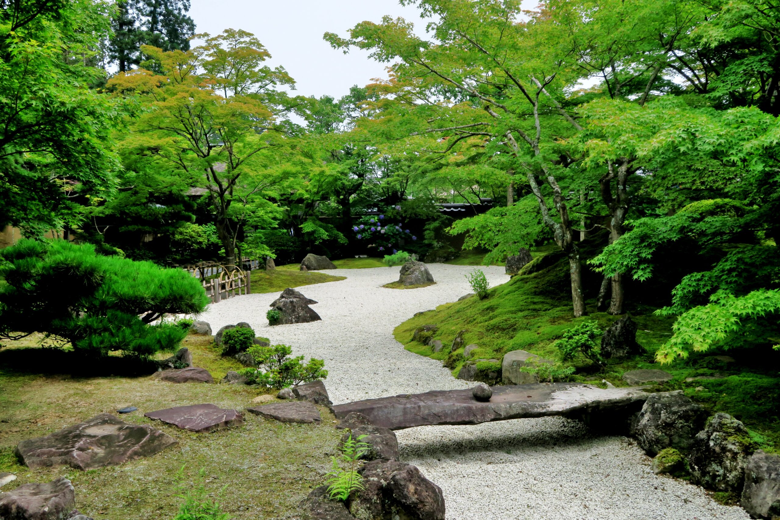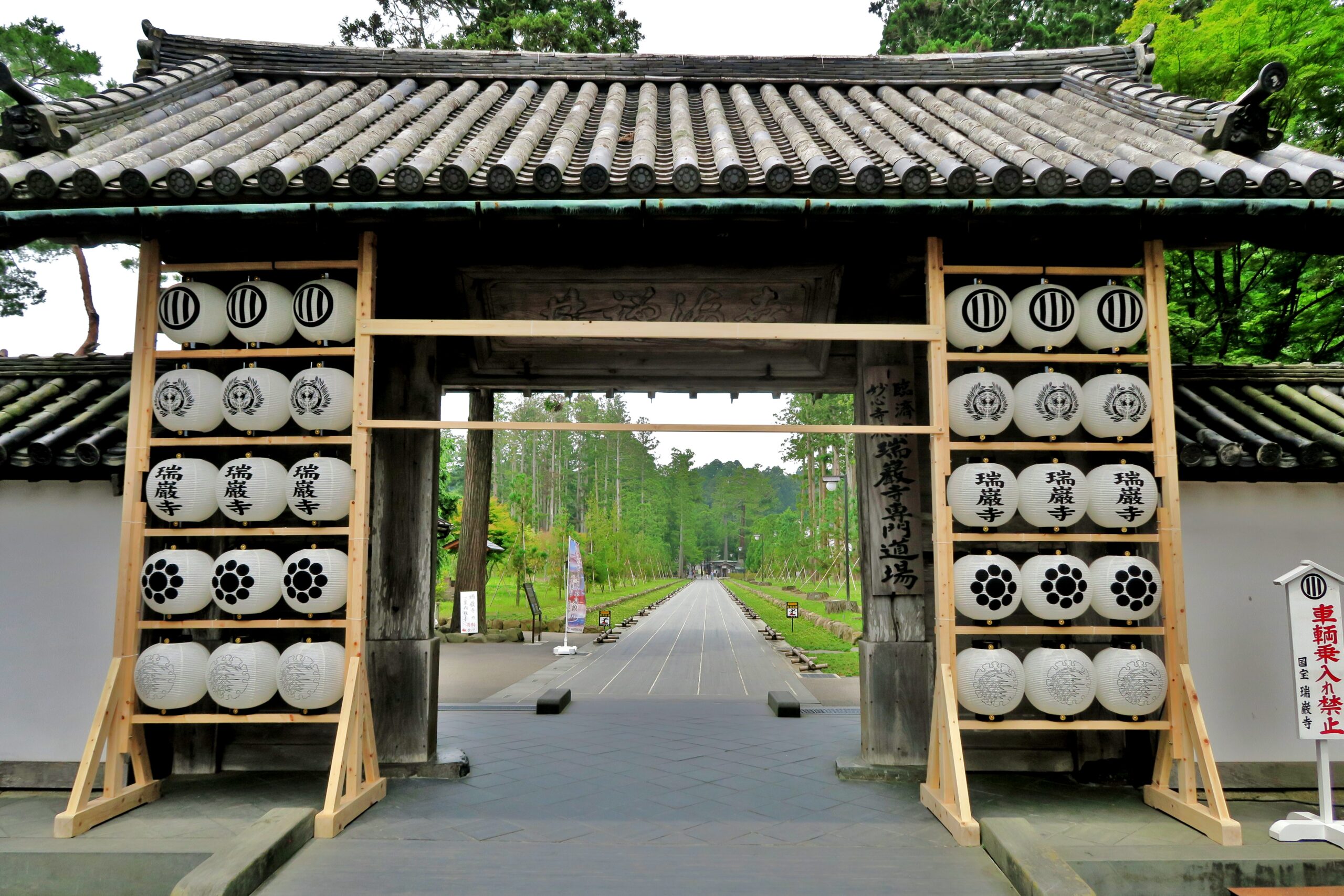 山門をくぐると小さな谷に広がる境内には、約350年前につくられた美しい石庭、枯山水の「雲外天地の庭」が現れます。この庭は、「天の庭」「地の庭」で構成され、「天の庭」は須弥山を中心に松島湾に実在する七福神の島を表しています。「地の庭」は、人生を石の三種類の仕上げで表していてその二つの庭を天水橋で結ばれています。