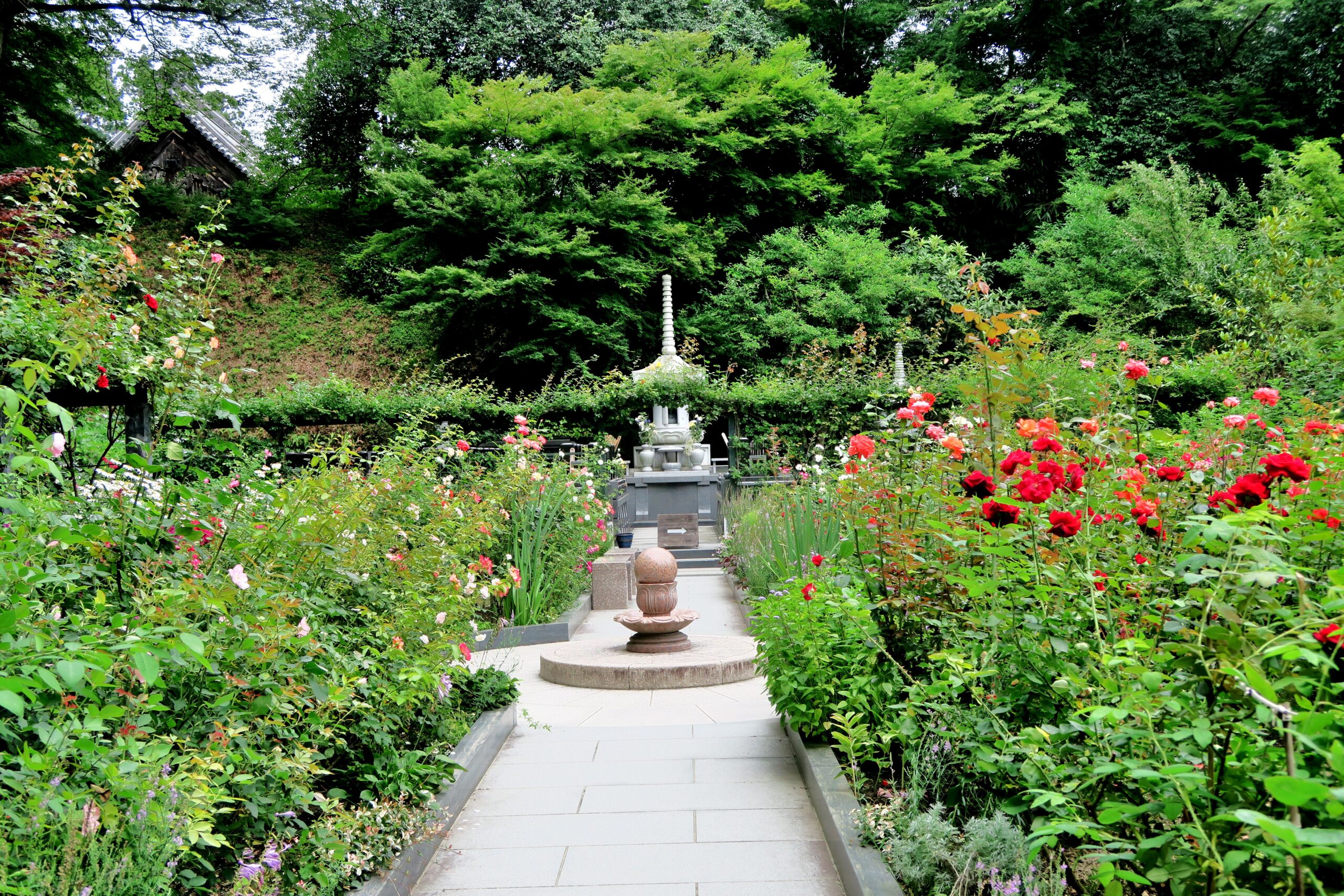 桃山様式の作風を伝える宮殿型厨子は、黒漆塗りの薄暗がりに燦然と輝く極彩色の意匠を施し、さながら万華鏡のようです。戦後まで厨子の封印が解かれなかったことが、装飾の色を鮮やかに保てた理由です。その逗子には白馬に跨る衣冠束帯の光宗君の像と殉死された七人の像が祀られています。見逃せないのが、向かって右の厨子の扉の内側に描かれた赤い薔薇の花で、金箔と鮮烈な赤の対比は妖艶ですらあります。壮麗な逗子の図案は支倉六右衛門常長が遣欧使節団として欧州に赴き、西洋から持ち帰った洋バラを描いたという説と日光東照宮では平安の意を込めた薔薇文様が多用されていることから同じく神道系祭祀として平安を示す薔薇が描かれたという説があります。薔薇園も厨子にちなみ先代住職が設けたものです。